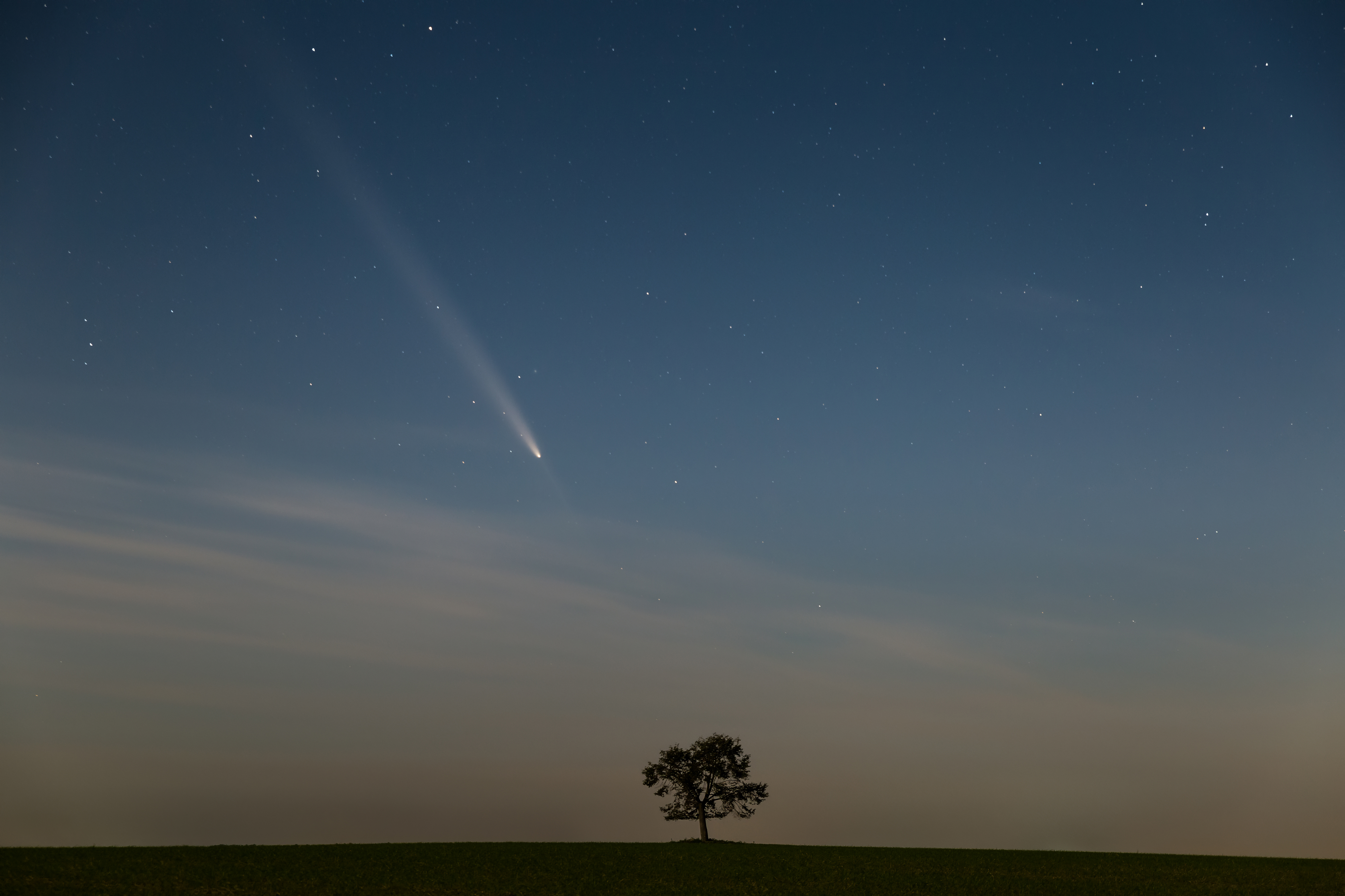 Nach einigen Tagen mit dicken Wolken, riss am Dienstag, den 15. Oktober, endlich die Wolkendecke auf und ich konnte zum ersten Mal den Kometen sehen und auch fotografieren. In Richtung Meißen unterwegs, um den Wolken zu entkommen, sah ich in der Ferne einen kleinen Hügel mit einem einzigen Baum auf der Kuppe. Das wars ... Gottseidank, hatte ich alles dabei, denn es ging über ein nasses Feld bis auf den Hügel. Den Anblick, als der Komet etwas später über dem Baum stand, werde ich nie wieder vergessen. Allerdings gab es beim Fotografieren einige Probleme mit den Lichtern der Ortschaften, die sich hinter dem Hügel befinden. Der Horizont wirkt deshalb auch etwas unruhig. Ein Schritt nach vorn oder nach hinten entschied darüber, ob man die Lichter der Orte am Horizont sieht oder ob der Baum abgeschnitten wurde. Ein Foto mit Kompromissen...