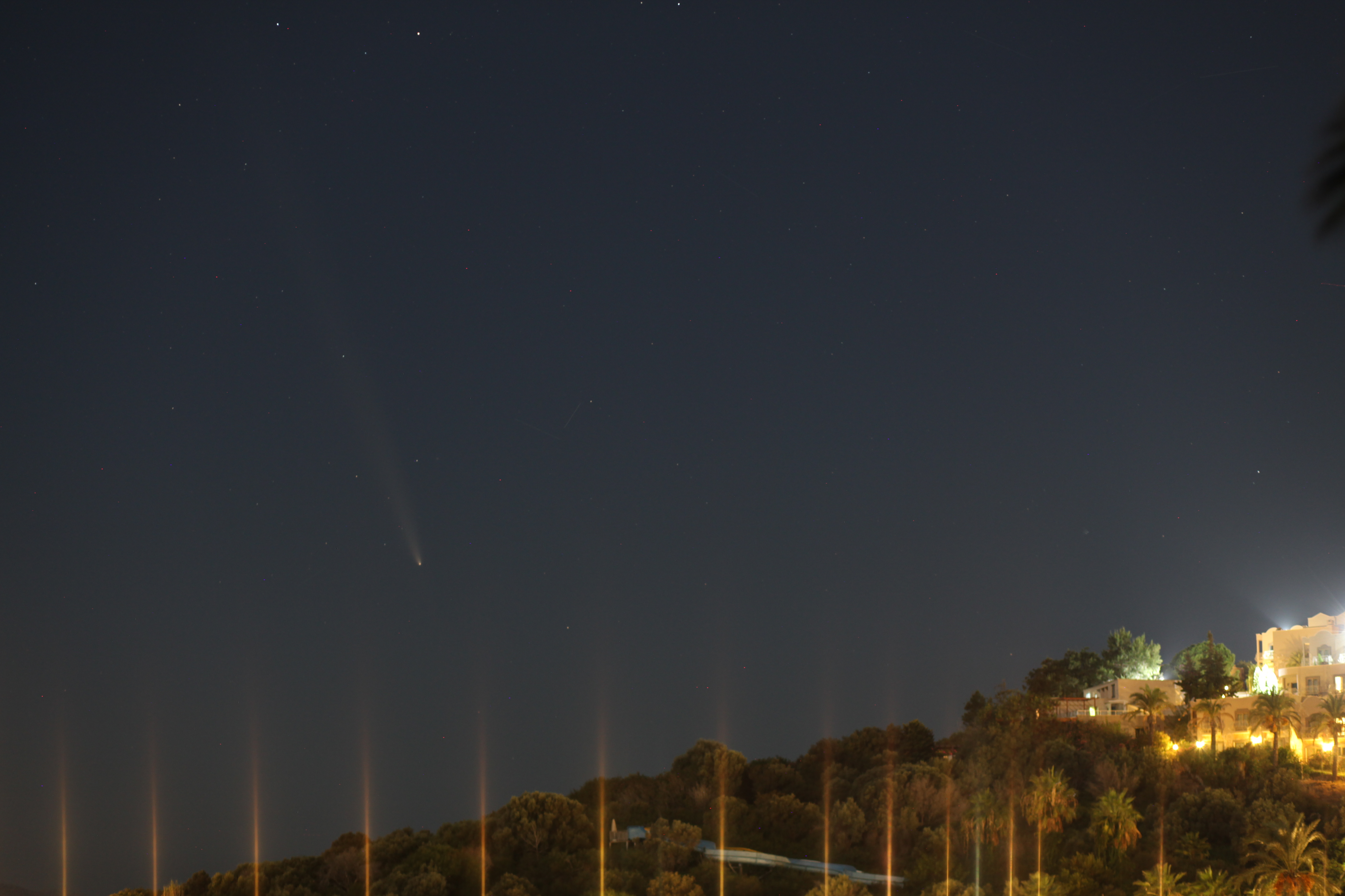 Am 15. Oktober zeigte sich der Komet kurz nach Sonnenuntergang. Schnell noch aus dem Geländer und dem eigenen T-shirt ein provisorisches Stativ gebastelt und mit der 5D Mark II losgelegt!