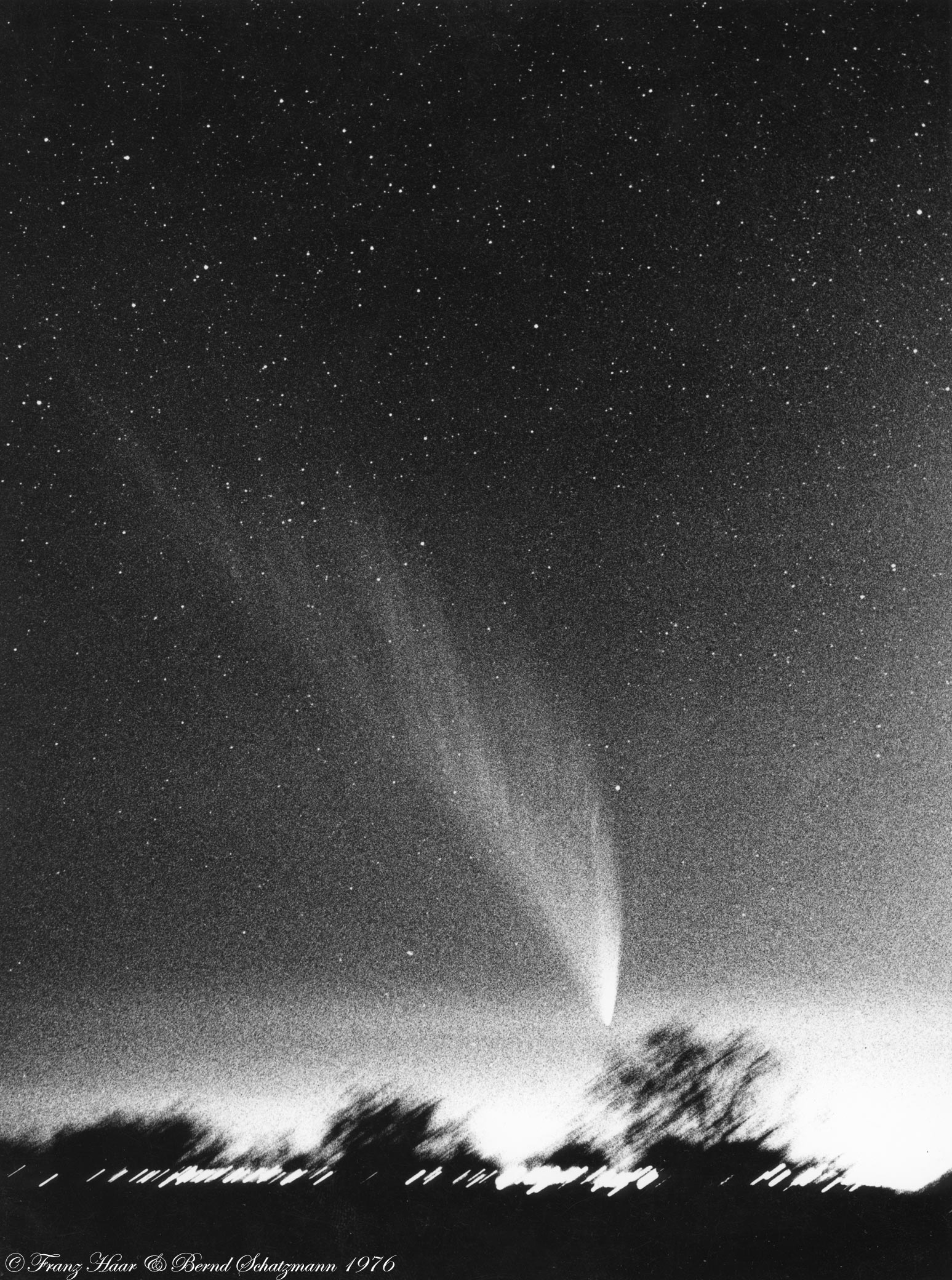 Einer der spektakulärsten Kometen der letzten Jahrzehnte war Komet West, der im März 1976 bis zu -3 mag hell wurde. Eine beeindruckende Aufnahme gelang in den Morgenstunden des 3. März Bernd Schatzmann und Franz Haar. Die beiden Astrofotografen nahmen Komet West an der vhs-Sternwarte Neumünster auf. Dazu verwendeten sie dem Kodak 103aE s/w-Film und ein 50-mm-Normalobjektiv. Belichtet wurde zwei Minuten bei Blende 2,8.