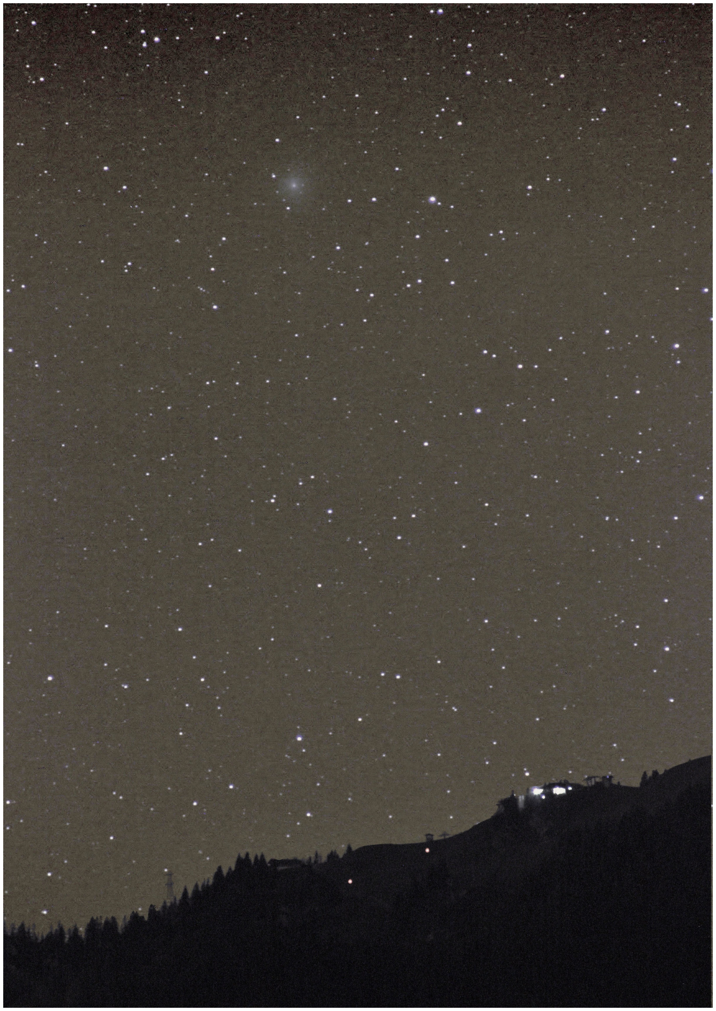Am 5. November 2018 befand sich Komet Wirtanen bei -32 Grad Deklination. Und so befand sich der Komet von meinem Beobachtungsort aus gesehen gerade einmal drei Grad über dem Berg Brauneck bei Lenggries. Um das Gipfelrestaurant nicht verwischt darzustellen, fertigte ich noch ein Foto mit ausgeschalteter Nachführung an und fügte diesen realistischen Vordergrund in die Sternfeldaufnahme ein.