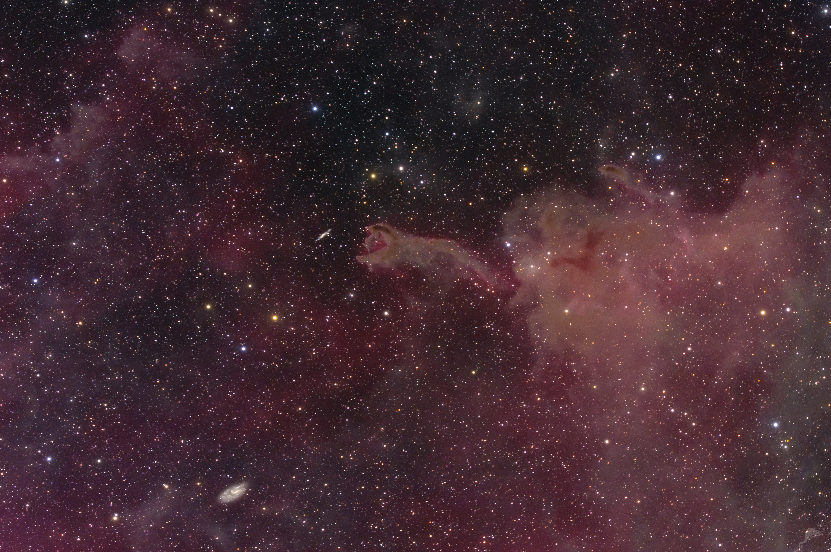 Die kometare Globule CG4 wird auch als "Hand Gottes" bezeichnet, die scheinbar nach der kleinen Galaxie ESO 257-19 greift. Die Aufnahem zeigt auch die sehr schwachen Ausläufer des Gum-Nebels nahezu über das gesamte Bild.