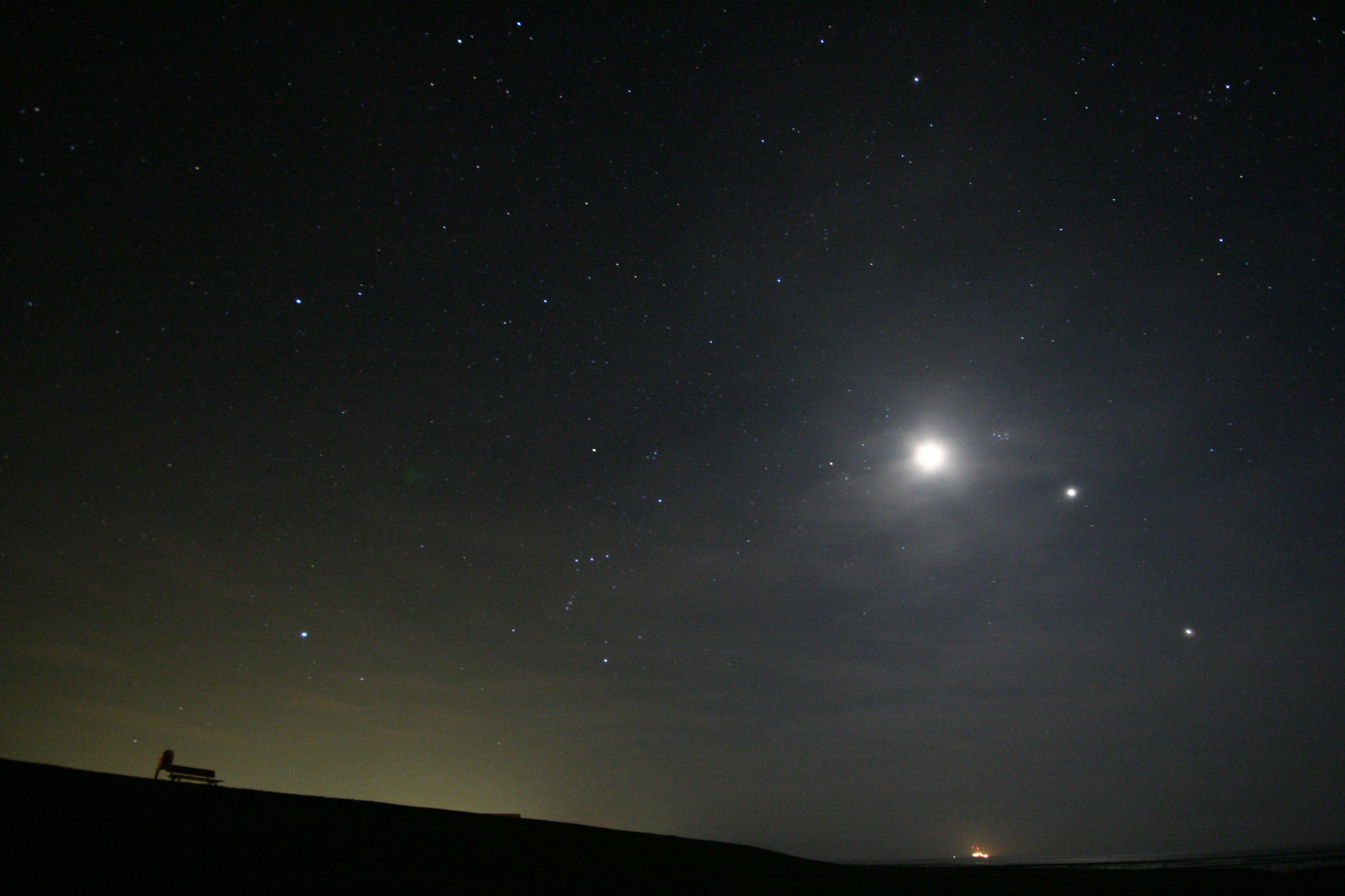 Am Deich bot sich eine gute Gelegenheit, die Konjunktion von Mond, Venus und Jupiter zusammen mit dem bald verschwindenden Wintersechseck abzubilden.