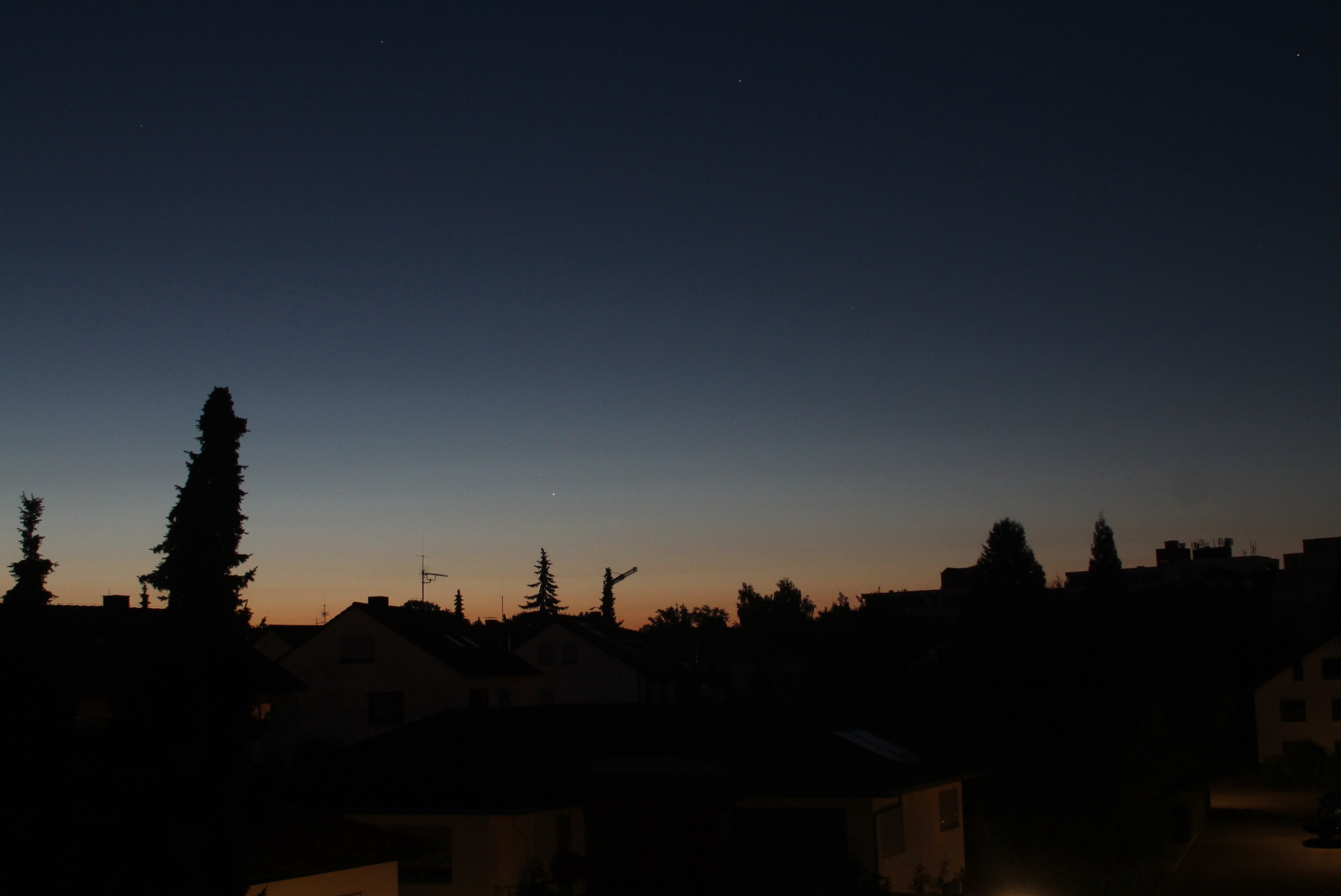 In der Morgendämmerung des 22. Juli 2013 konnte ich die Konjunktion der Planeten Mars und Jupiter gut fotografieren. Jupiter, der hellere und südlichere der beiden Planeten war mit bloßem Auge gut zu sehen, während man schon genau hinsehen mußte, um auch den wesentlich lichtschwächeren Mars zu erkennen.