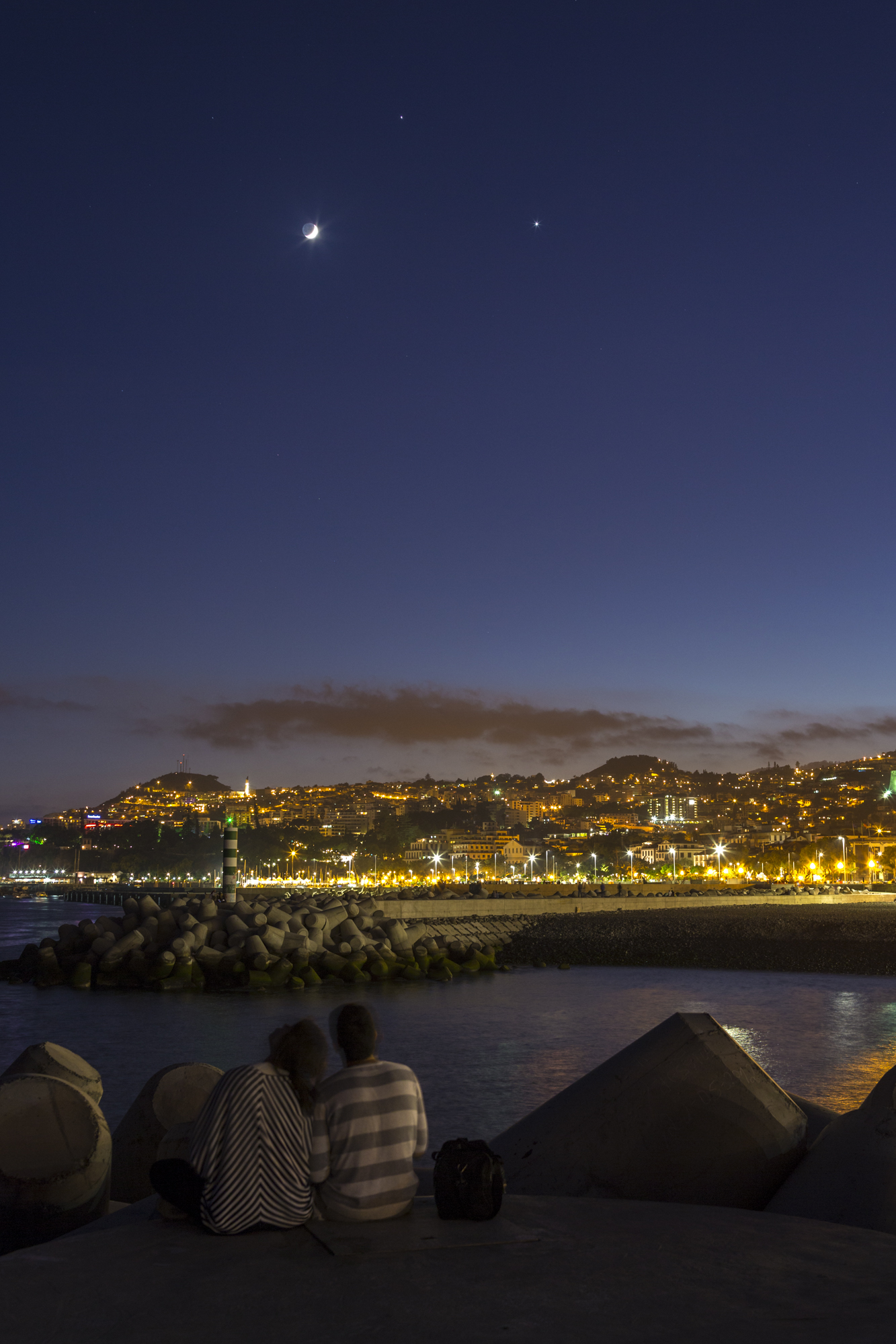 Konjunktion von Venus, Jupiter und Mond am Hafen von Funchal, Madeira.