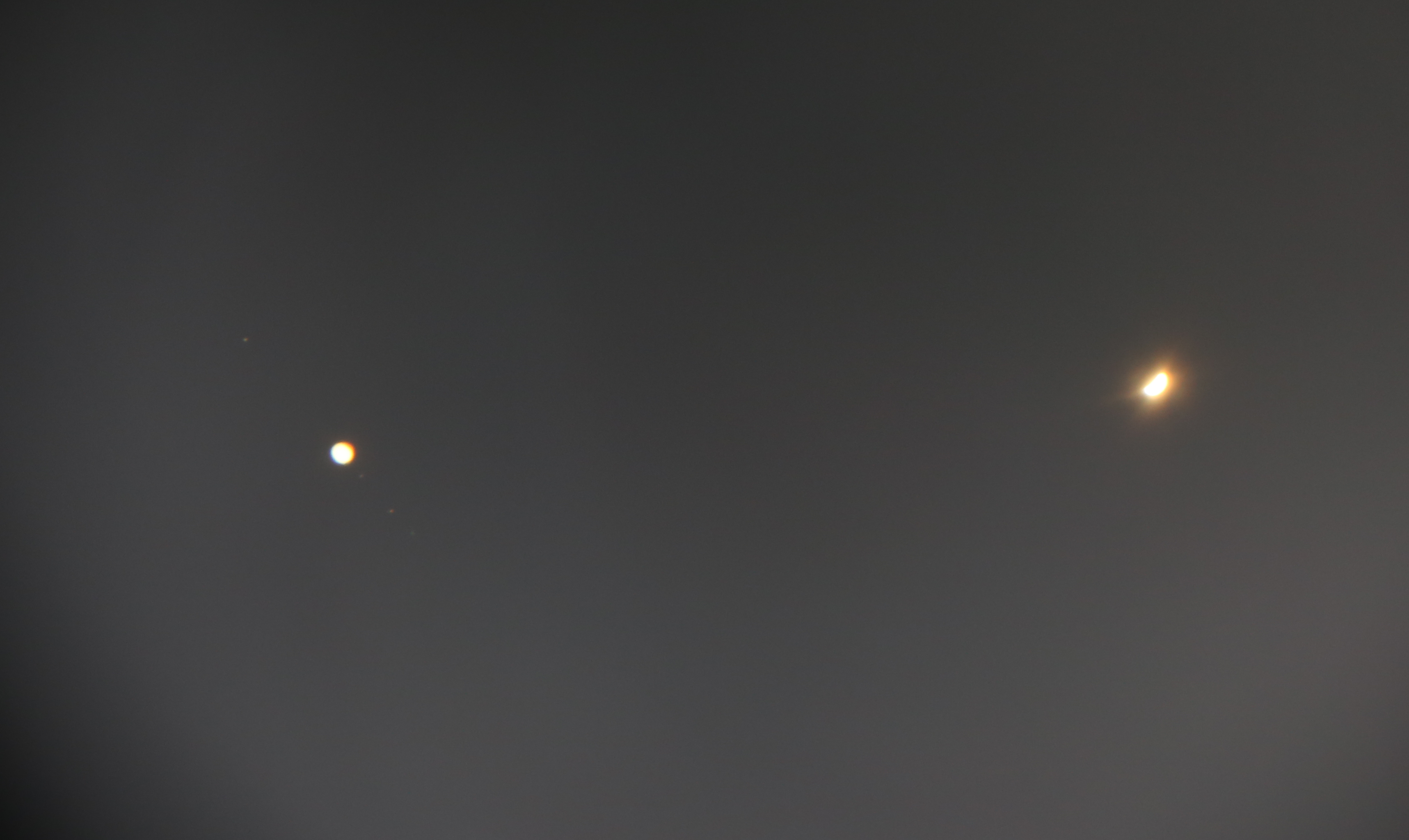 Ein faszinierendes Bild, zwei Himmelskörper so nah beieinander zu sehen, die doch soweit hintereinander stehen - und zufällig gleich groß wirken, weil die Entfernung des Jupiters etwa das gleiche Vielfache wie sein Durchmesser gegenüber der Venus ist.