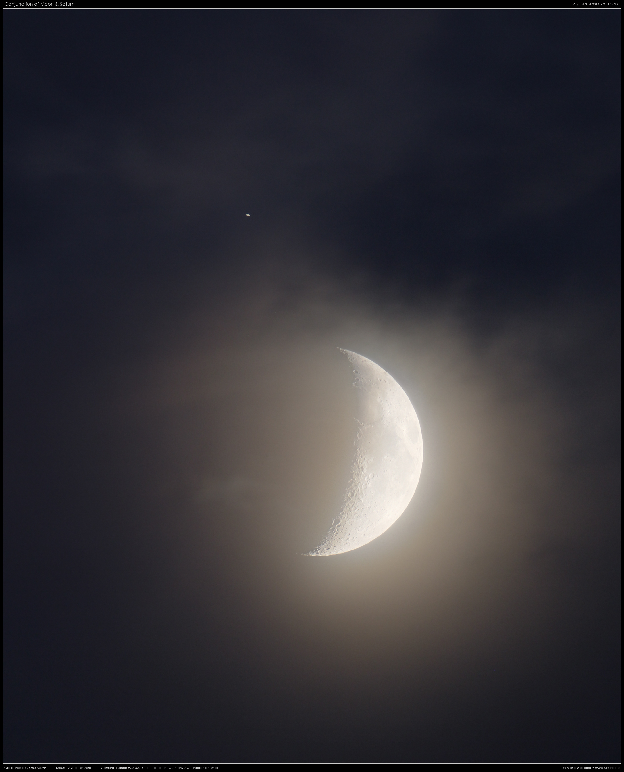 Was das Wetter am Abend des 31. August 2014 angeht, hatte ich mir deutlich besseres erhofft … Nur ab und zu kamen Mond und Saturn zwischen den Wolkenschichten hindurch. Aber zwei Schnappschüsse sind es trotzdem geworden. Als Aufnahme-Kombination kam ein 75-Millimeter-Refraktor von Pentax mit Canon EOS 600D auf der Montierung Avalon M-Zero zum Einsatz.