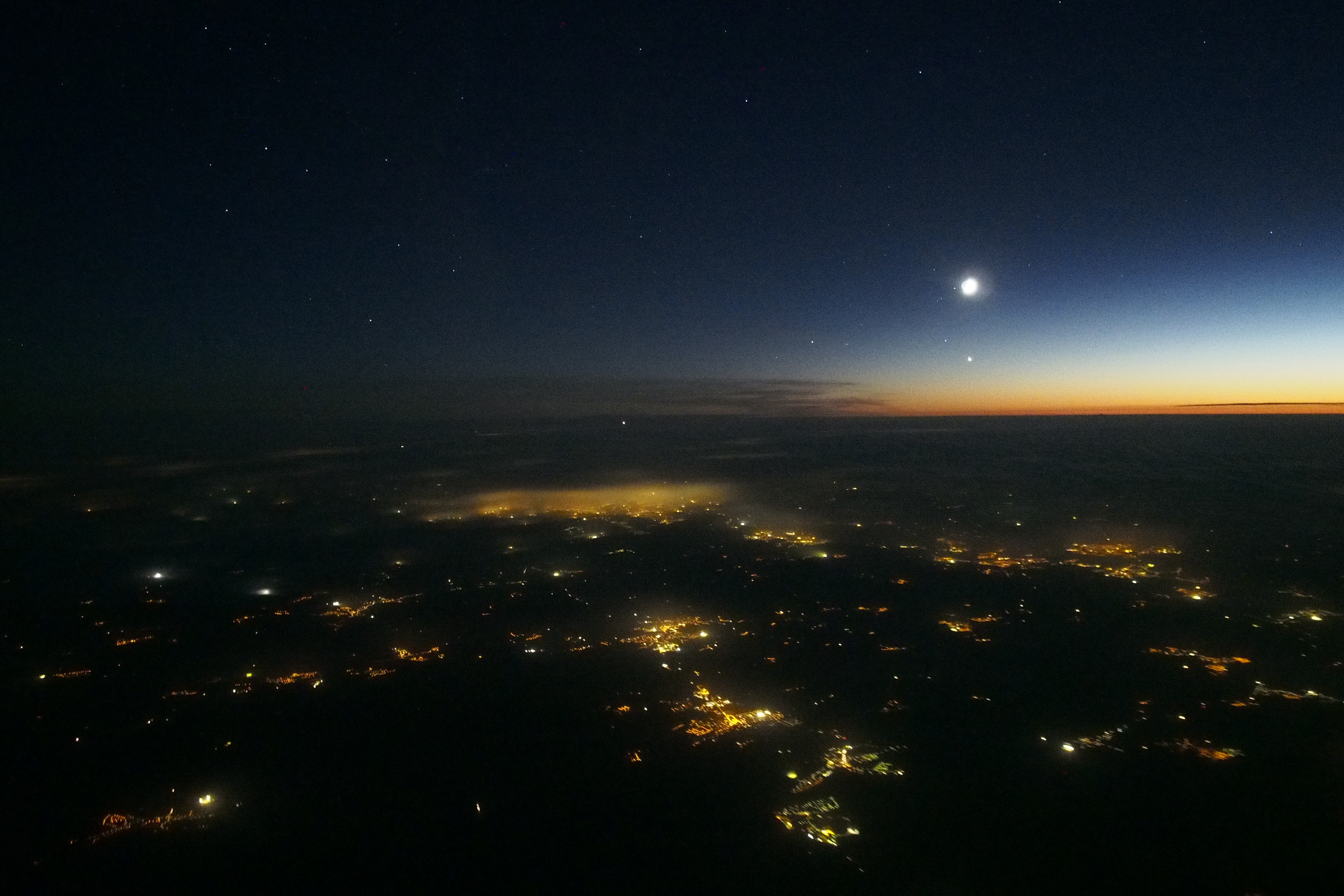 Im Anflug auf München verschwand für kurze Zeit der Hochnebel. Unter der Konjuktion von Mond und Venus erschienen die Städte und Dörfer Bayerns in der späten Abenddämmerung