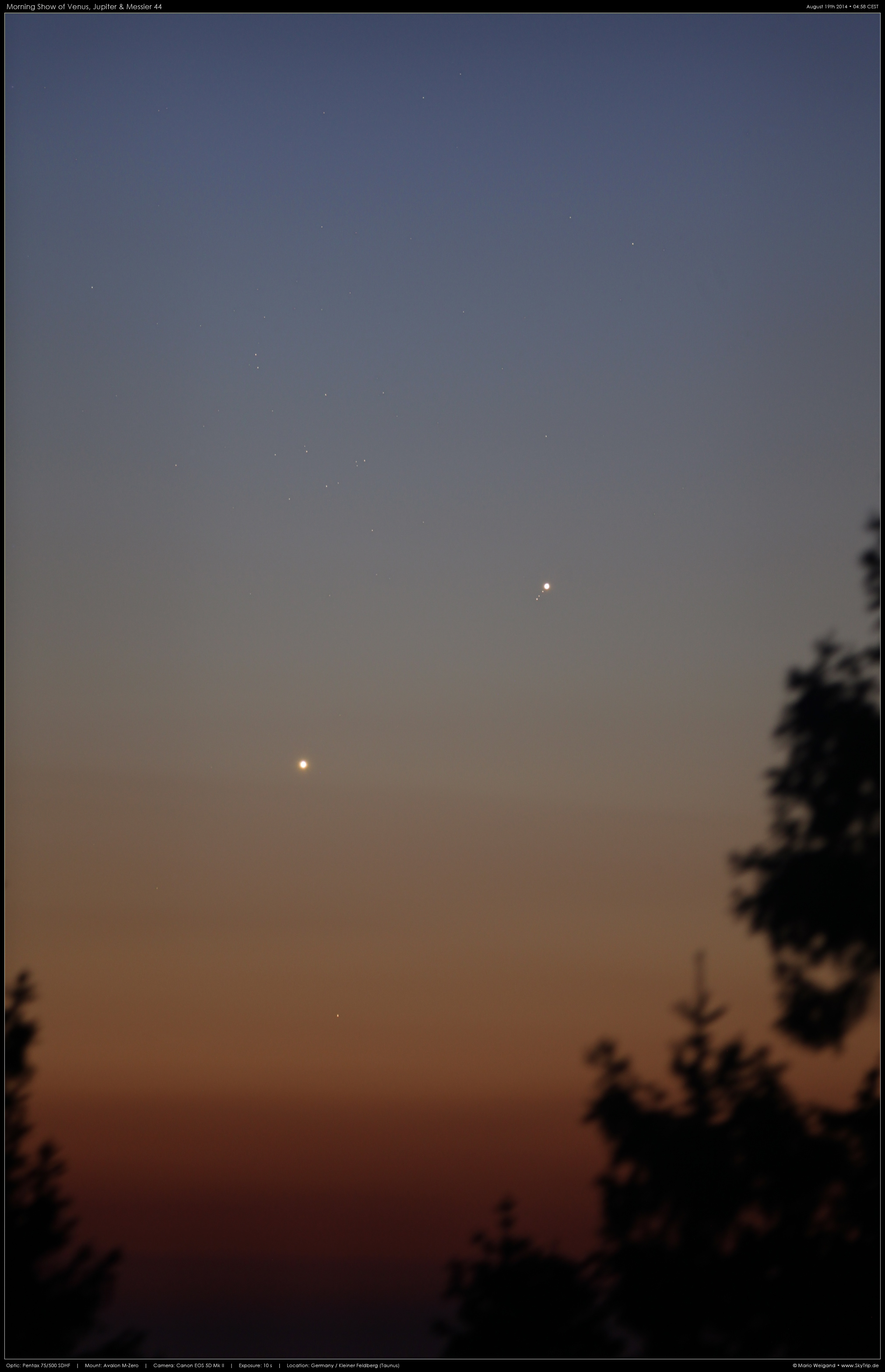 Die hellsten Planeten Jupiter und Venus in Konjunktion – mit dem hellen offenen Sternhaufen Messier 44 im Hintergrund. Auf dem Bild sind darüber hinaus auch die Galileischen Monde zu erkennen. Für dieses Foto bin ich am 19. August 2014 gegen 3:30 Uhr auf den Kleinen Feldberg im Taunus gefahren, wo ich eine gute Horizontsicht hatte. Als Aufnahmeoptik diente der kleine Pentax 75 SDHF-Astrograf auf der Avalon M-Zero Montierung. Zehn Sekunden habe ich mit der Canon EOS 5D Mark II bei ISO 640 belichtet.