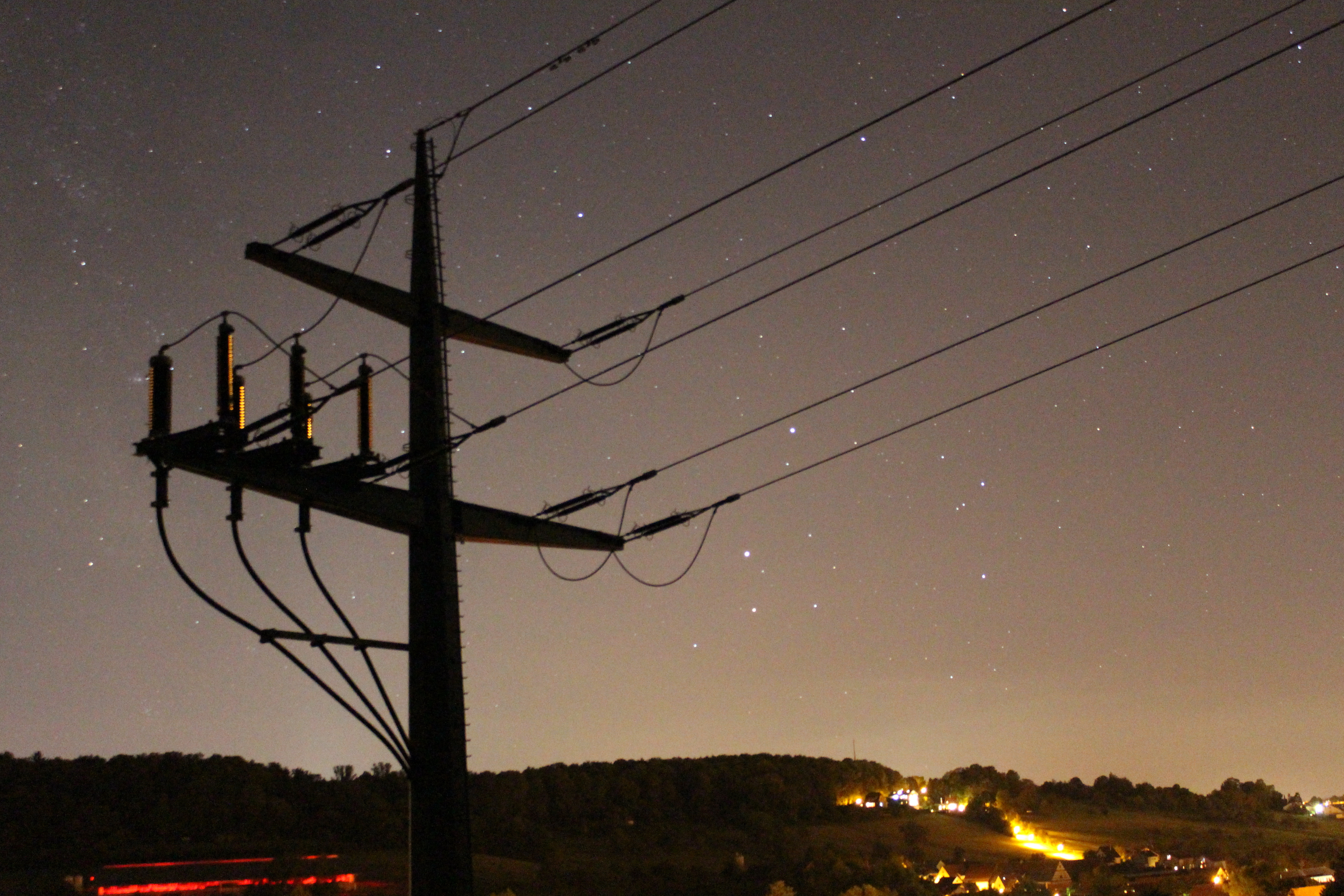 Konjunktion zwischen den Planeten Mars und Saturn am 25. August 2016, mit dem Endmast der 110 kV-Leitung Göppingen-Schorndorf, östlich von Bartenbach, im Vordergrund.