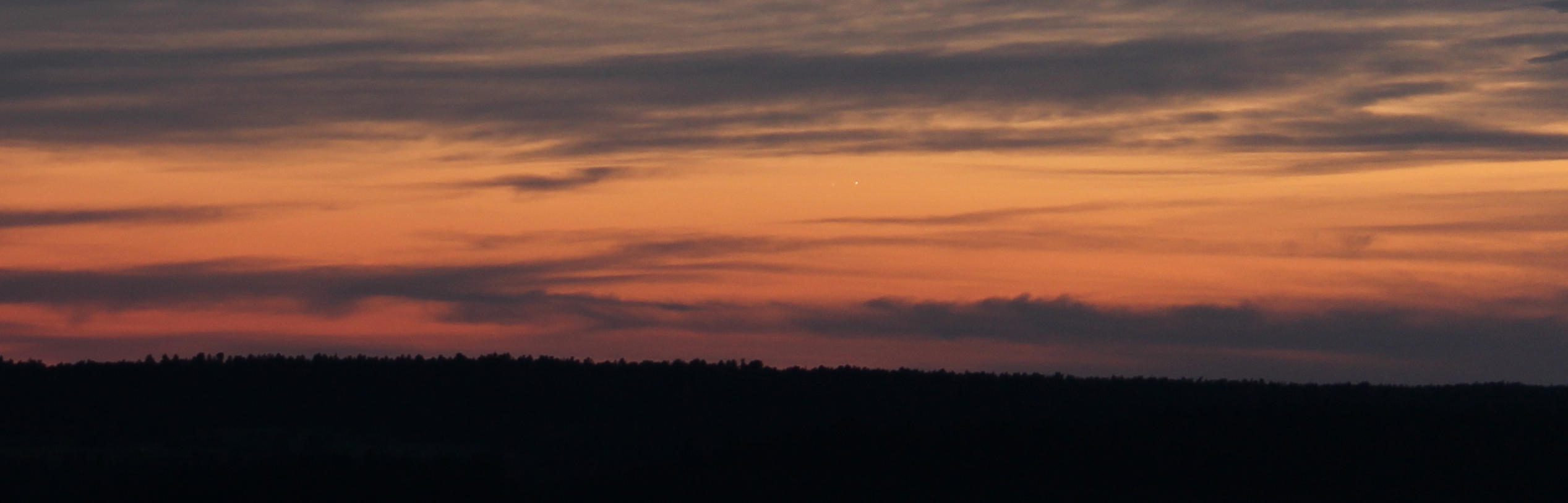 Ich habe nicht gedacht, daß ich das Zusammentreffen der Planeten Venus und Jupiter am Abend des 27. August 2016 fotografieren kann, denn über dem Westhorizont waren zahlreiche Wolken. Als Beobachtungsstandort wählte ich den Westhang des Galgenbergs bei Calw-Stammheim aus, von dem man einen sehr freien Blick in Richtung Westen hat und machte dort Aufnahmen. Auf einem Bild waren beide Planeten zu sehen, wenn auch Jupiter nur schwach.