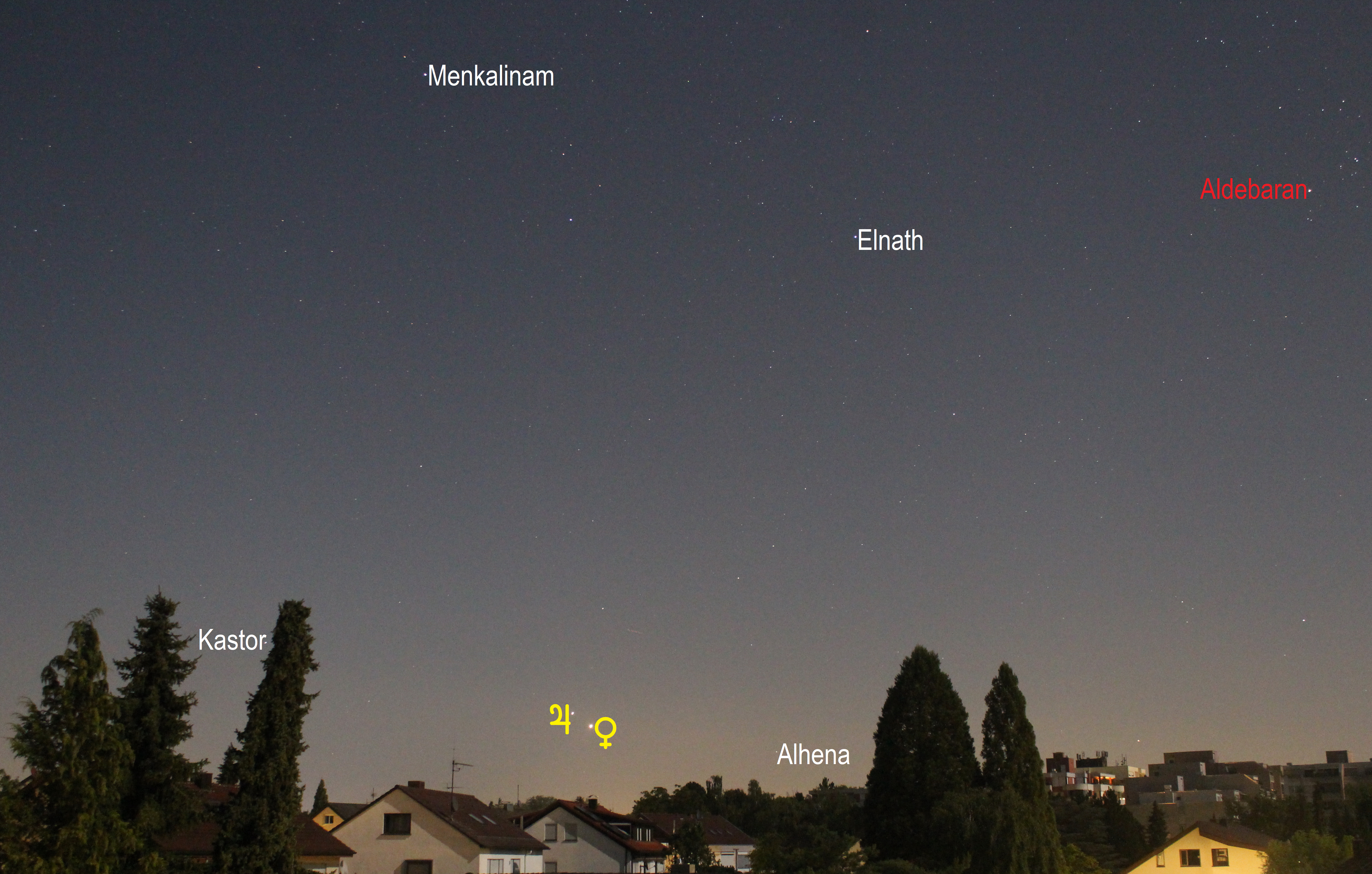 Leserbilder Astronomie: Konjunktion zwischen Venus und Jupiter mit kurzer Brennweite (Objekte beschriftet)
