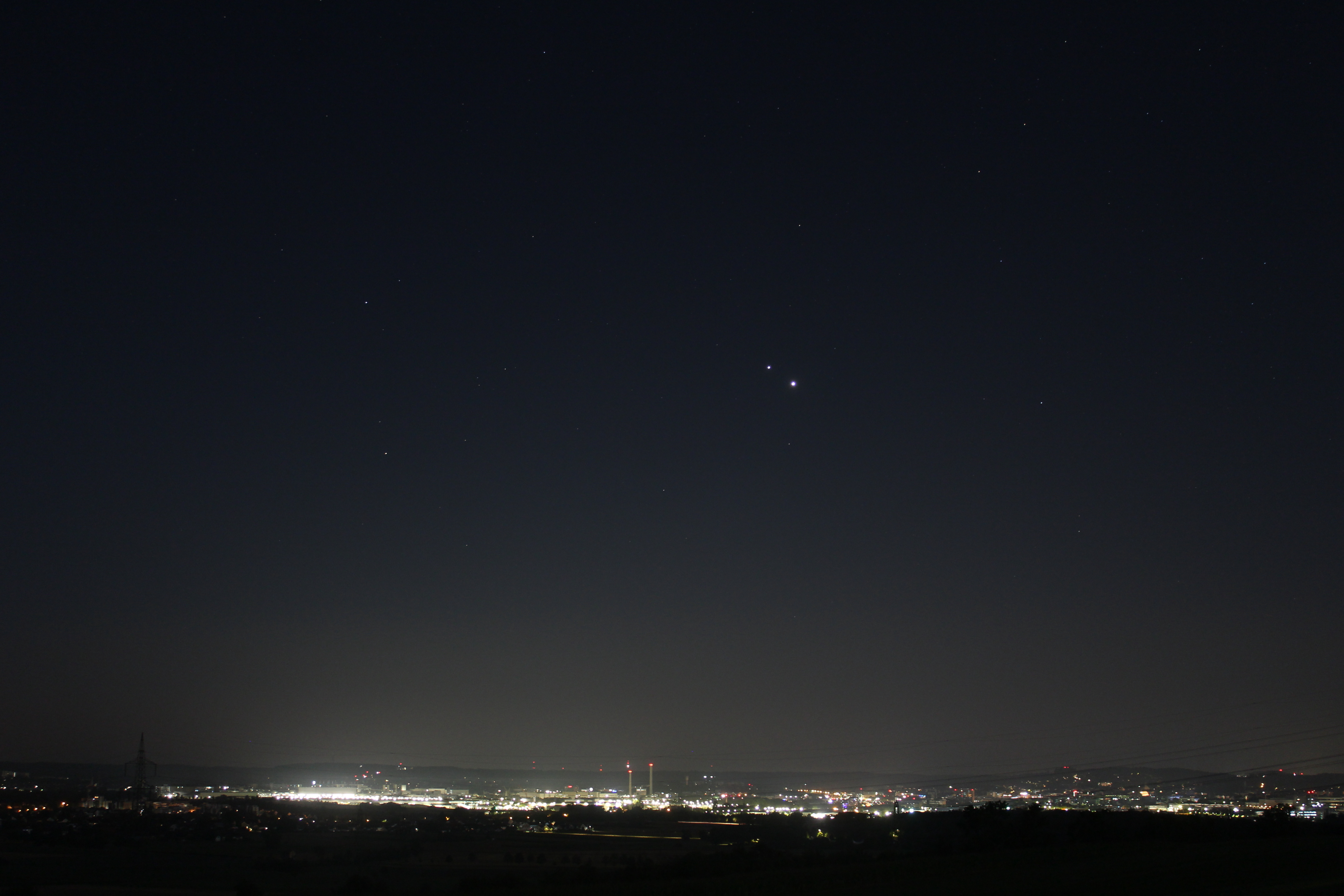 Gegenseitige Konjunktion der Planeten Venus und Jupiter über Sindelfingen und Böblingen, aufgenommen nördlich von Ehningen.