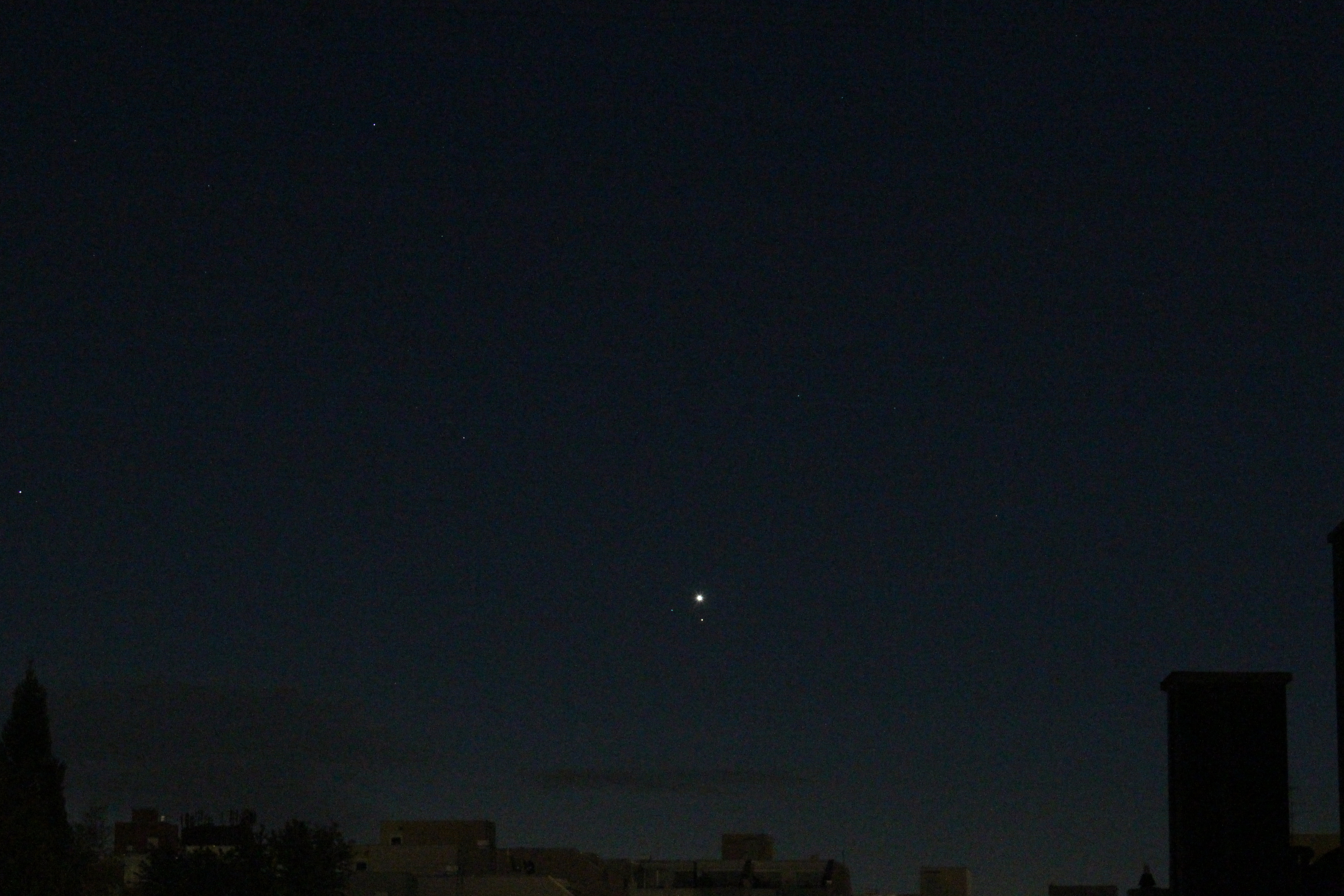 Bei unerwartet klarem Himmel konnte ich vom heimischen Fenster aus die Konjunktion der Planeten Venus und Mars am Morgen des 5. Oktober 2017 fotografieren. Der lichtschwache Mars steht unterhalb der viel helleren Venus steht und verblasst in ihrem Glanz. Ich habe das Ereignis mit drei verschiedenen Brennweiten fotografiert.