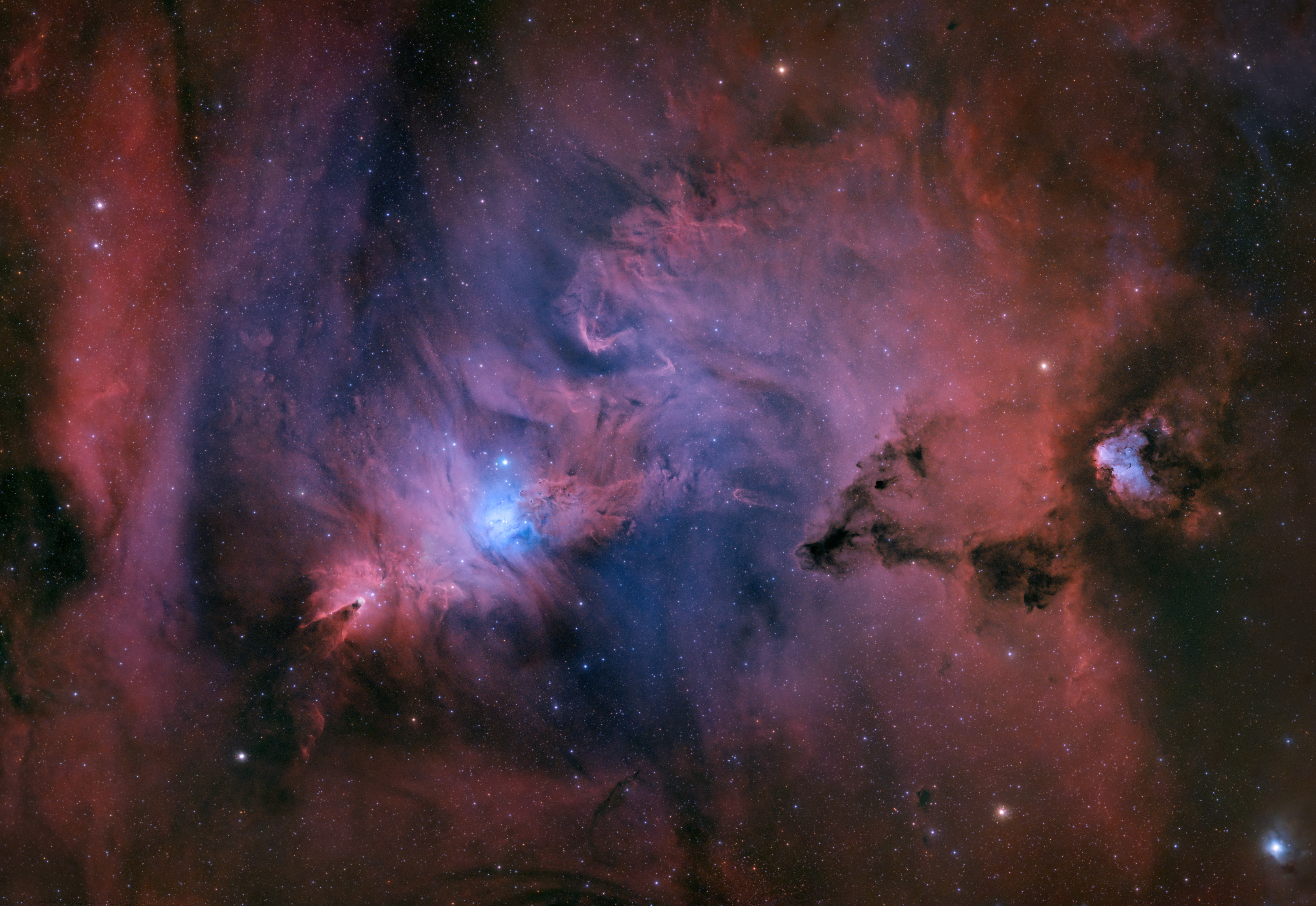 Für diese Version des Konusnebels und des Christmas Tree Clusters im Sternbild Einhorn habe ich bei der Bearbeitung RGB-Daten (3:45 h ohne Filter) und Schmalbanddaten (Ha: 3:20 h, OIII: 4:20 h) kombiniert, um besonders die Gasregionen dieser spektakulären Region stärker herauszuarbeiten.