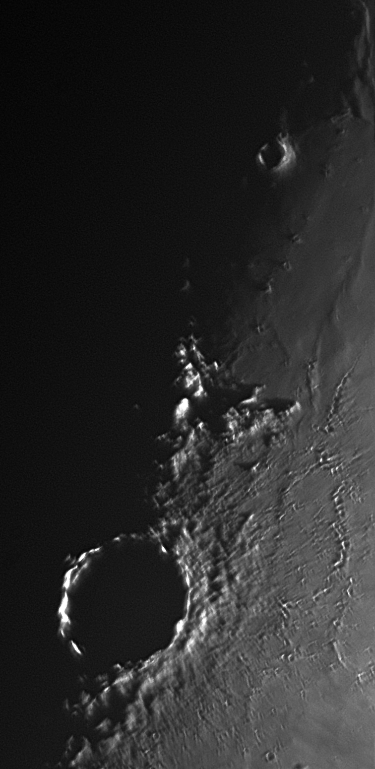 Am 5. April 2017 lag der Krater Kopernikus exakt am Terminator. Nur der obere Rand war beleuchtet und die Ejekta (äußerer Kraterabhang sowie die vielen Sekundärkrater) waren plastisch hervorgehoben. Zwischen Kopernikus und Gay-Lussac fallen fünf Krater etwa gleicher Größe auf, die wie an einer Schnur aufgereiht sind und mir gänzlich unbekannt sind.