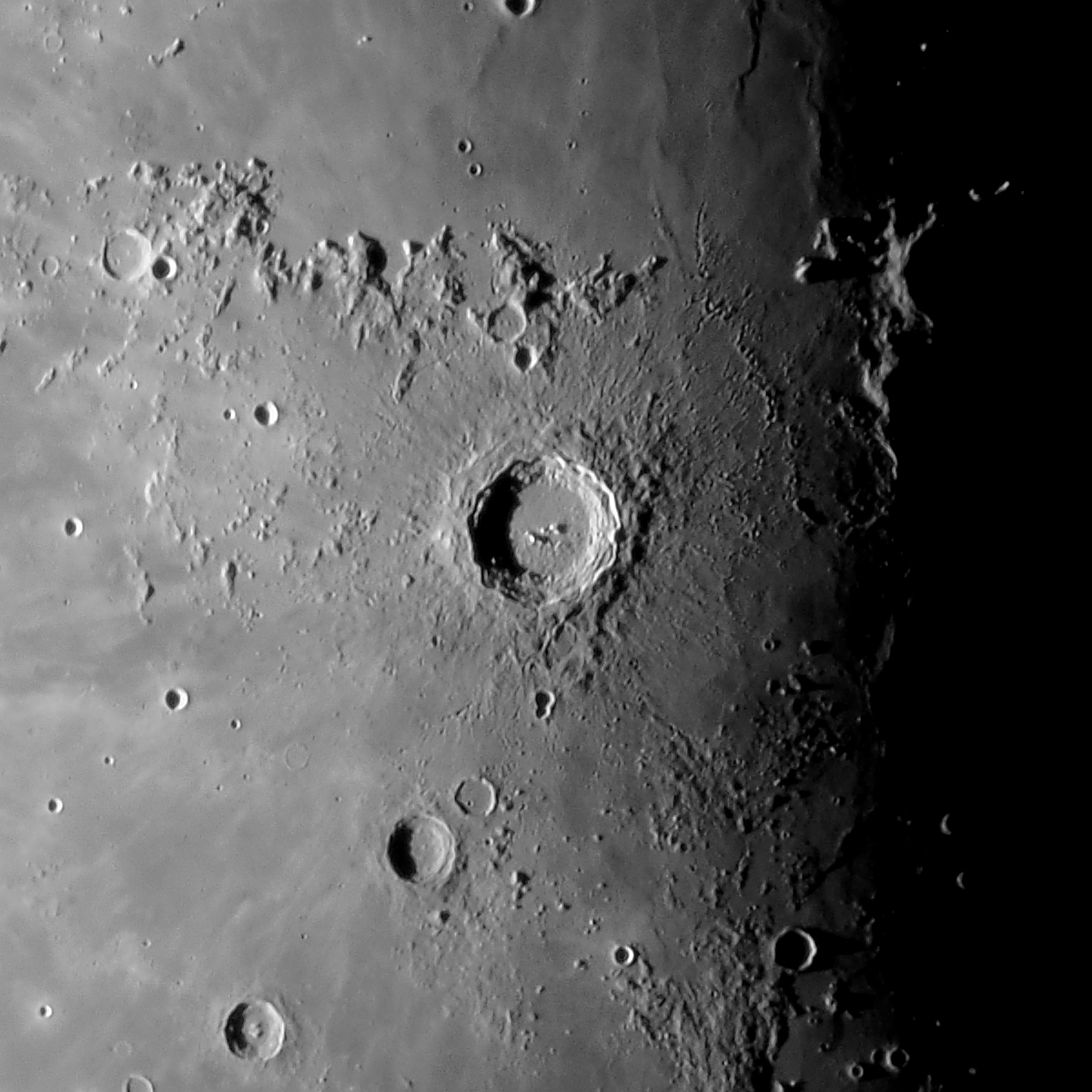 Der wohl schönste und bestimmt auch am meisten fotografierte Mondkrater, hier in der selten zu sehenden Beleuchtung bei abnehmendem Mond. Die Bildbearbeitung erfolgte so, das auch die Terminatorregion gut zu sehen ist.