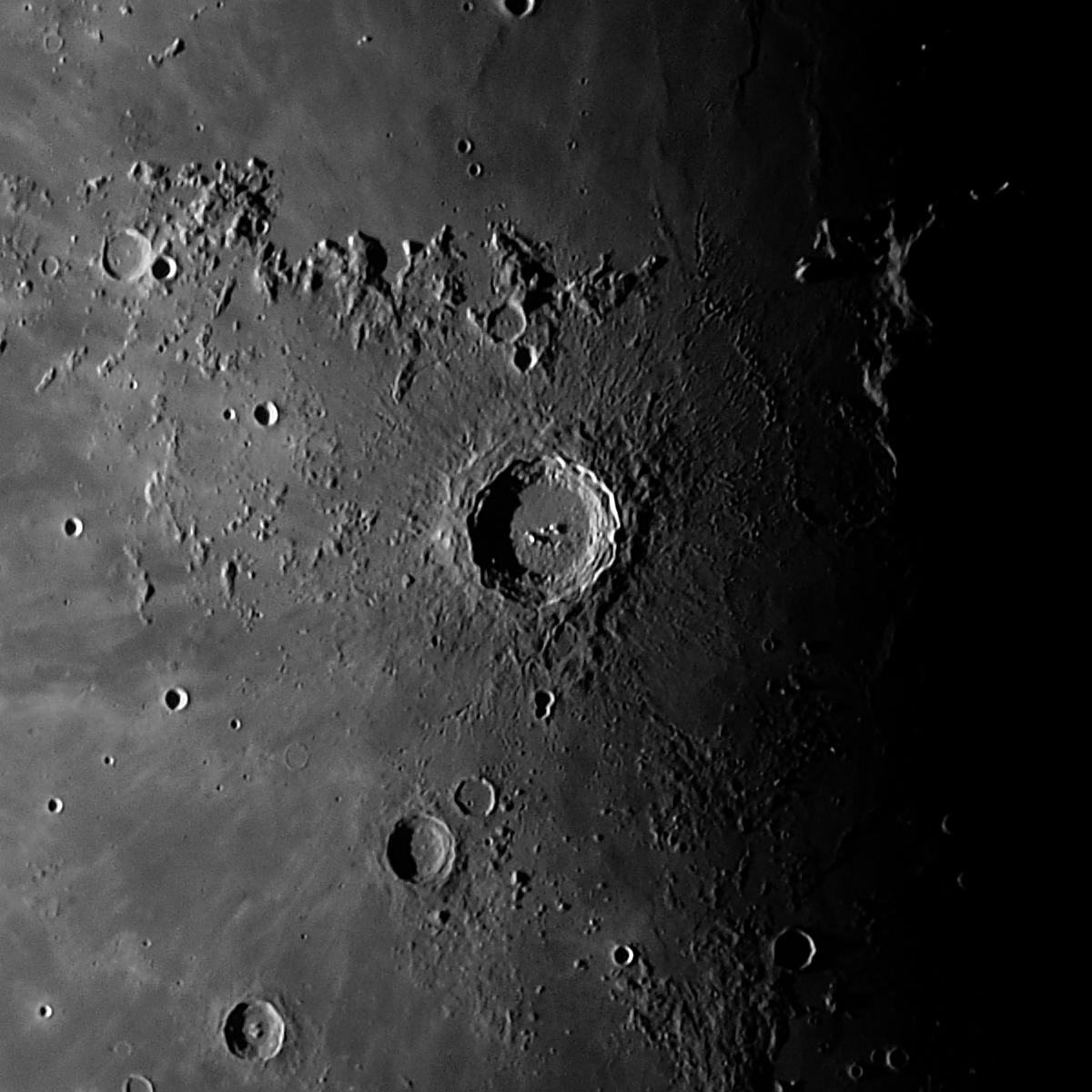 Der wohl schönste und bestimmt auch am meisten fotografierte Mondkrater, hier in der selten zu sehenden Beleuchtung bei abnehmendem Mond. Die Bildbearbeitung erfolgte so, das das westlich gelegene Gebiet von Kopernikus schön kontrastreich zu sehen ist.