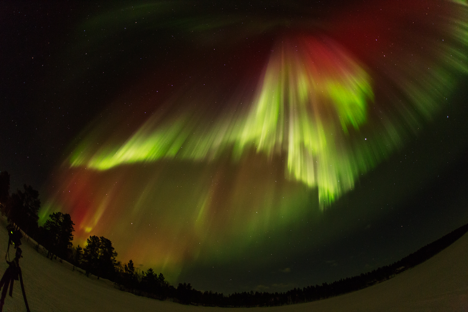 Beeindruckende Korona über dem Menesjärvi-See im finnischen Lappland im Februar 2015. Wir waren überwältigt und wussten gar nicht, wohin wir schauen oder fotografieren sollten! Glücklich konnte sich schätzen, wer ein Fisheye-Objektiv sein Eigen nannte!