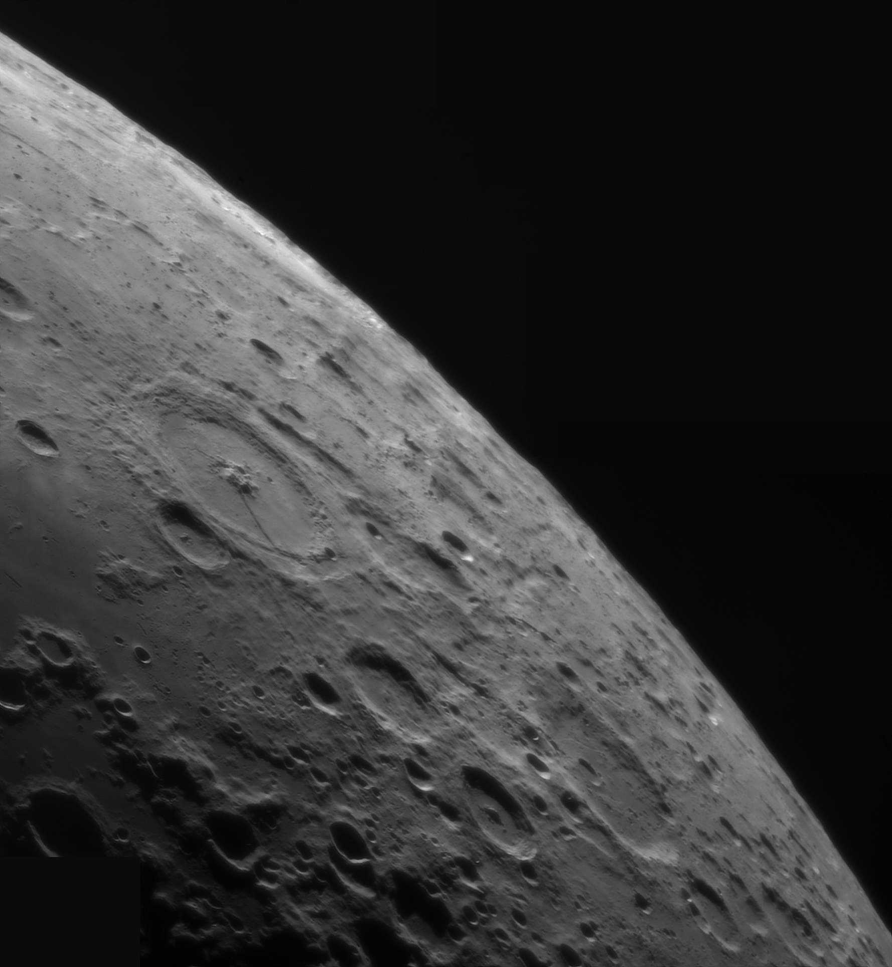 Krater, die sich nahe des Randes der südlichen Mondhälfte befinden, zeigen sich bei der üblichen Bildausrichtung mit Norden oben kopfüber. Mit einer entsprechenden Drehung wie hier 90 Grad gegen den Uhrzeigersinn ergibt sich eine neue Perspektive. So blicken wir bei der Wallebene Humboldt – benannt nach Wilhelm von Humboldt, dem Bruder des großen Naturforschers Alexander von Humboldt – nahezu frontal auf die inneren Terrassenhänge des Kraterwalles. Unterhalb von Humboldt erkennt man das Ringgebirge Petavius mit seinen Rillen, im rechten unteren Bildviertel die Wallebene Furnerius, die ebenfalls eine Rille zeigt.