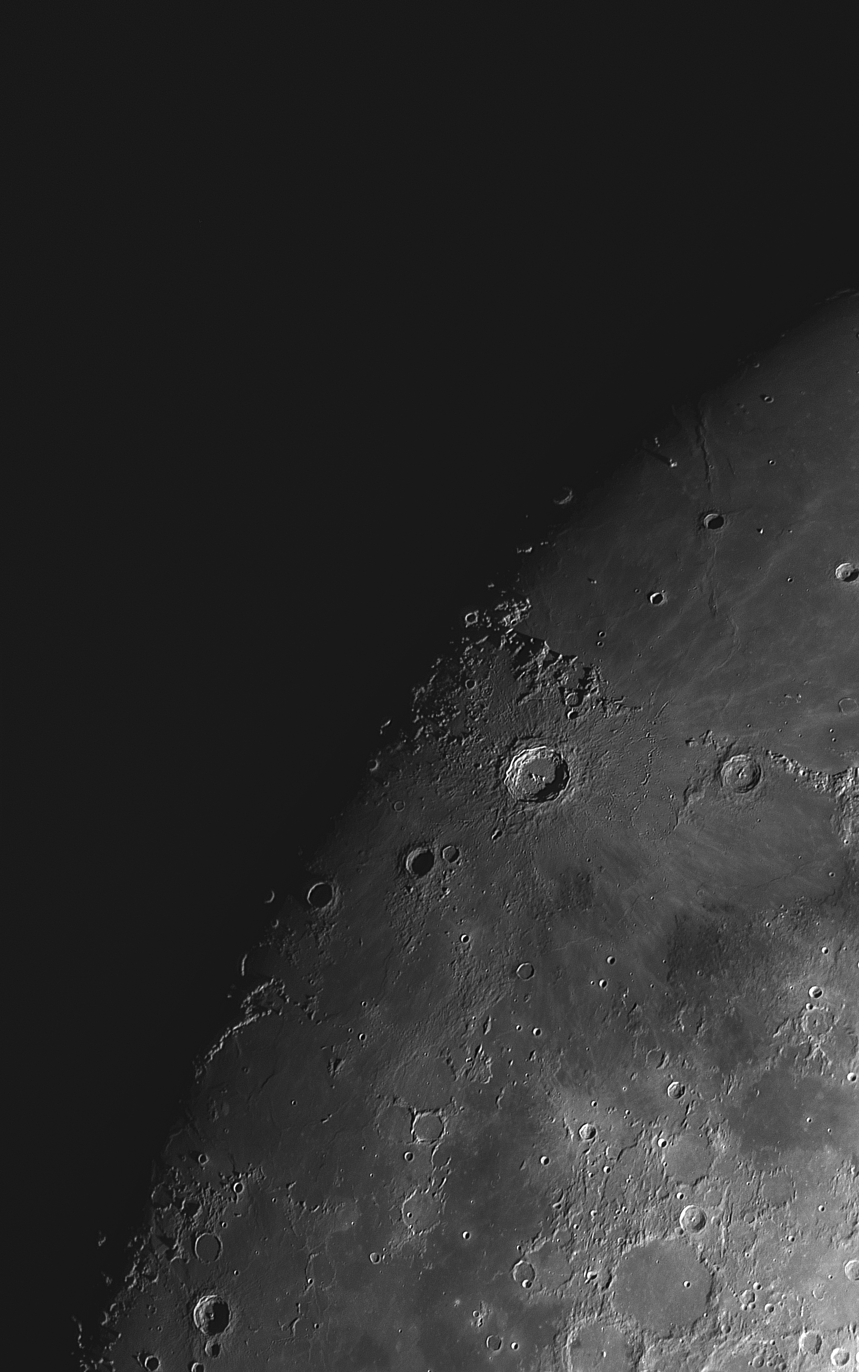 Am 3. Juli 2017 kam der Terminator Kopernikus sehr nahe. Deshalb hoben sich Zentralberge, Wall, Ejekta und Sekundärkrater sehr plastisch hervor.