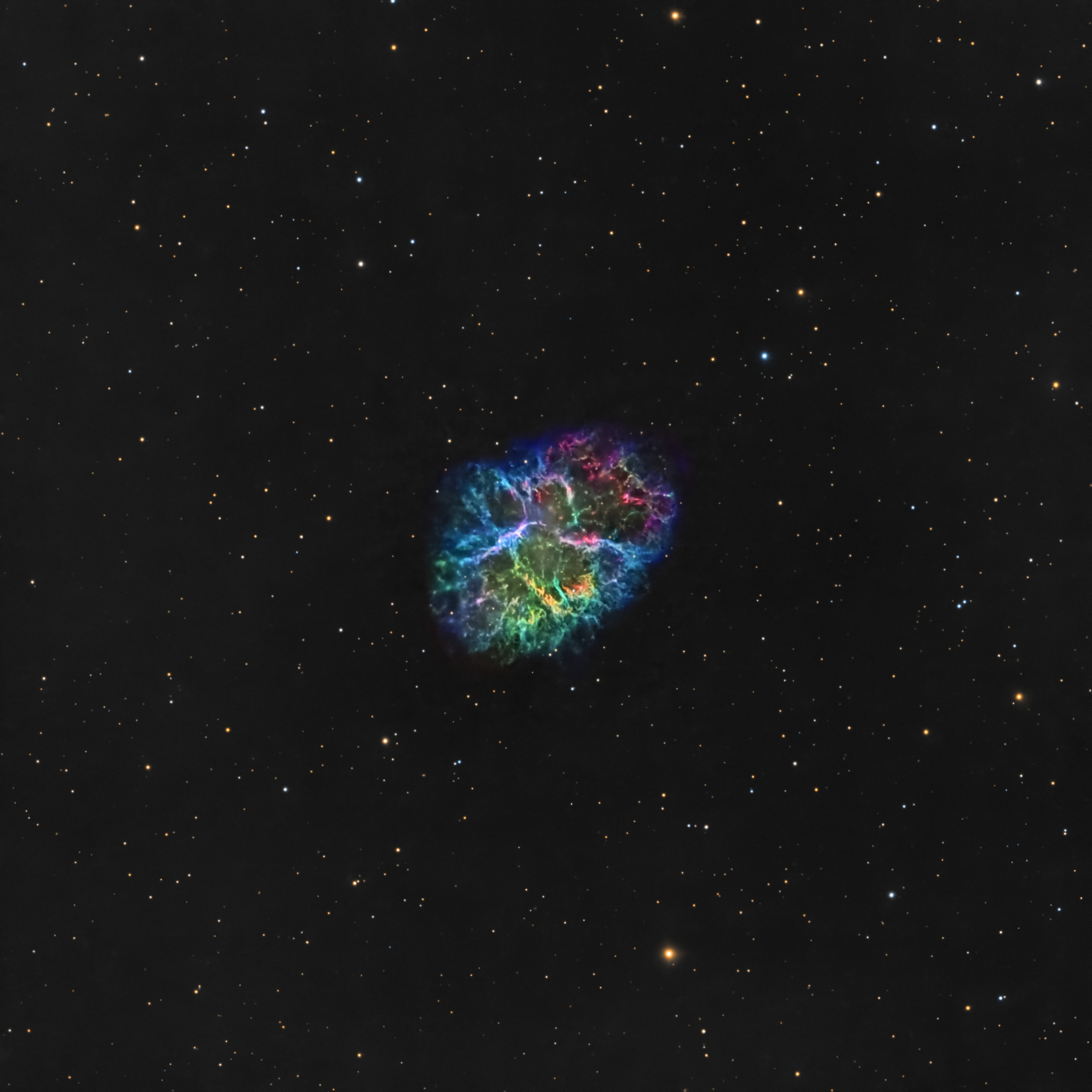 Messier 1 (auch bekannt als Krebsnebel, Taurus A, M1 oder NGC 1952) ist ein expandierender Supernova-Überrest und Pulsarwindnebel. Es ist der einzige Supernova-Überrest, der in Messiers Katalog aufgeführt ist, und das berühmteste Objekt seiner Art am Nachthimmel. Der Nebel hat eine Gesamtleuchtkraft, die das 75.000-fache der Sonne beträgt, und liegt in einer Entfernung von 6500 Lichtjahren von der Erde. Er hat einen Durchmesser von etwa elf Lichtjahren und dehnt sich mit einer Geschwindigkeit von etwa 1500 Kilometern pro Sekunde weiter aus. Der Krebsnebel ist das Ergebnis einer Supernova-Explosion, SN 1054, die 1054 n. Chr. von chinesischen Astronomen beobachtet wurde. Es war das erste Deep-Sky-Objekt, das mit einer historischen Supernova-Explosion in Verbindung gebracht wurde. Die Explosion des Vorläufersterns erzeugte eine große Hülle aus Filamenten, die ionisiertes Gas enthielt, das für das Leuchten des Nebels verantwortlich ist, das sich seitdem immer weiter ausdehnt und sich schließlich auflöst und im umgebenden Raum verschwindet. Der Krebsnebel wurde 1731 vom englischen Astronomen John Bevis entdeckt. Bevis fügte das Objekt seinem Himmelsatlas Uranographia Britannica hinzu, der 1750 fertiggestellt, aber nie veröffentlicht wurde. Charles Messier entdeckte den Nebel am 28. August 1758 auf der Suche nach einem hellen Kometen selbstständig und trug ihn am 12. September als erstes Objekt in seinen Katalog ein.