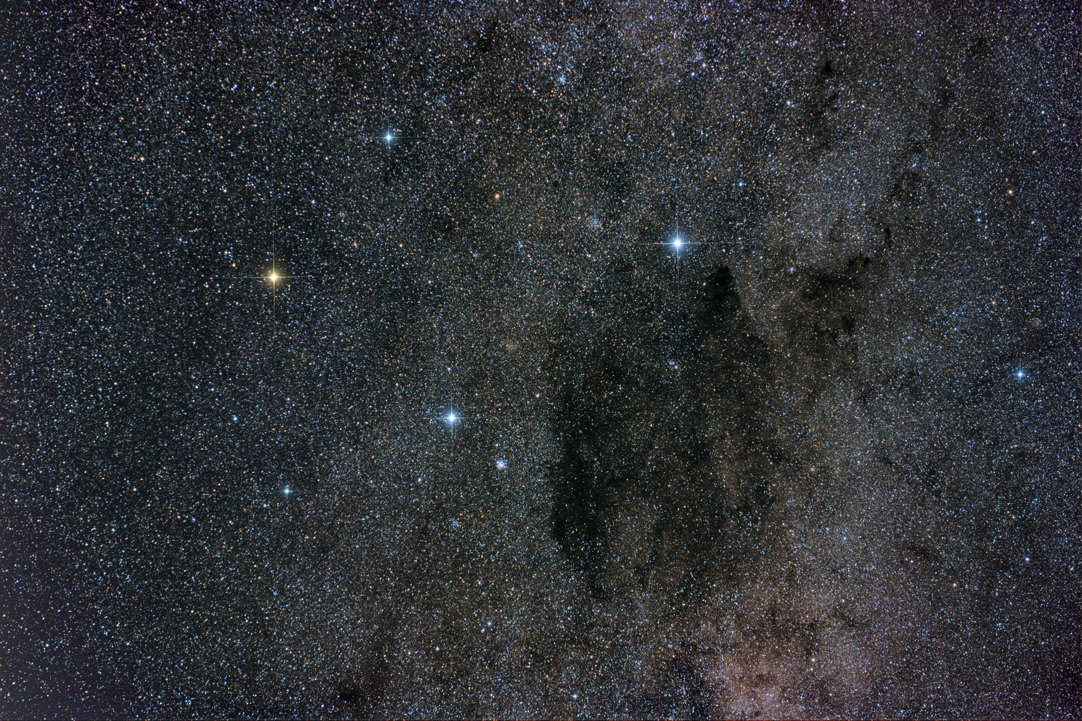 Das prominenteste Sternbild des Südhimmels besteht aus vier bunt leuchtenden Sternen in einem dichten Sternfeld, das nur durch einen der größten Dunkelnebel unterbrochen wird, dem Kohlensack. Hier schwächt eine dichte Wolke aus Staub das Licht der dahinter liegenden Sterne und erzeugt die dunklen Strukturen, die in dieser lang belichteten Aufnahme zu beobachten sind. Weitere Bilder bei www.astro-cabinet.com