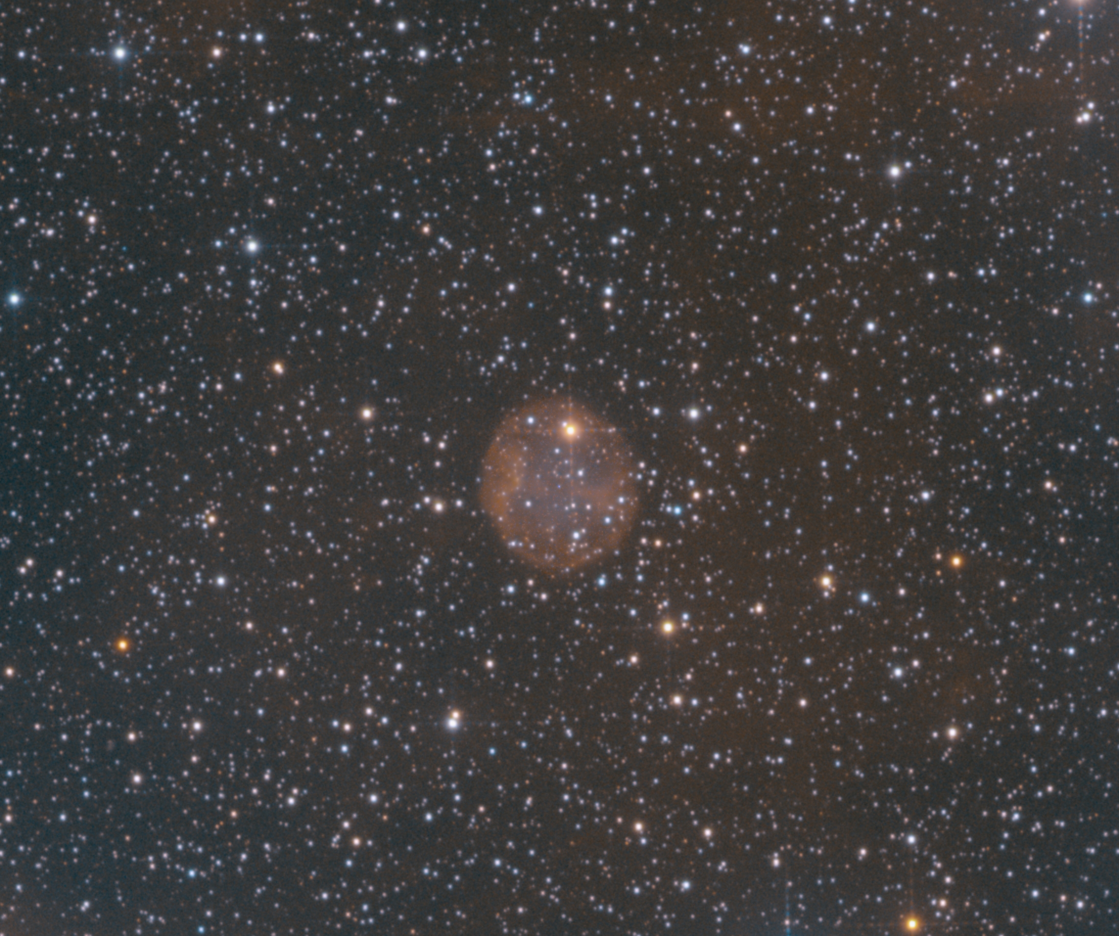 Diese Aufnahme wurde wieder mit dem bewährten 16-Zoll-Newton erstellt. Die Belichtungszeit liegt bei insgesamt 16 Stunden, wobei nur zwölf Stunden in die Luminanzdaten geflossen sind. Vier Stunden wurden mit dem aufgesattelten Refraktor in RGB-Sterne investiert. Wenn dies auch kein typisches "pretty picture" ist, zeigt es dennoch einen bislang nahezu unbekannten PN in ansprechender Auflösung .