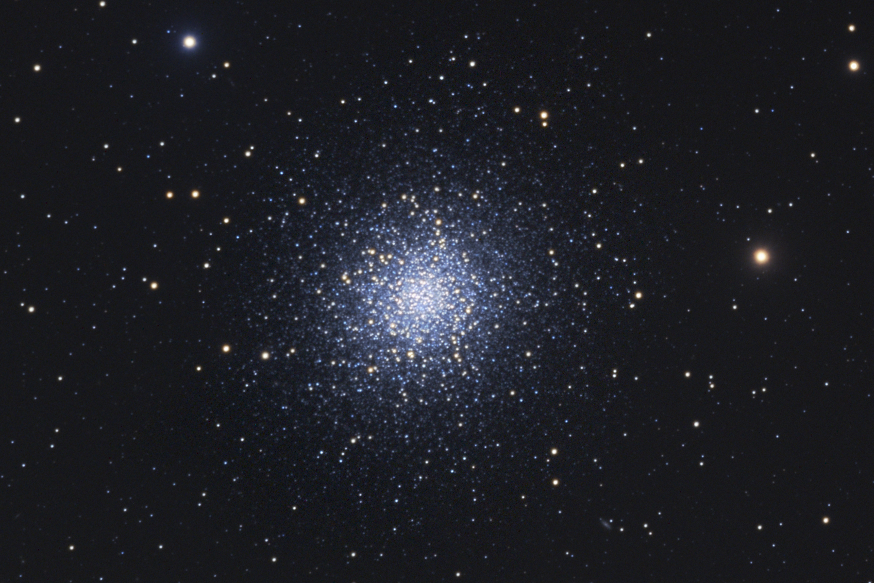 Der Kugelsternhaufen M 13 ist ca. 25 000 Lichtjahre entfernt und hat einen Durchmesser von ca. 300 Lichtjahren. Er besteht aus etwa 300 000 Sternen. Er ist von der Winkelausdehnung an der Himmessphäre der größte