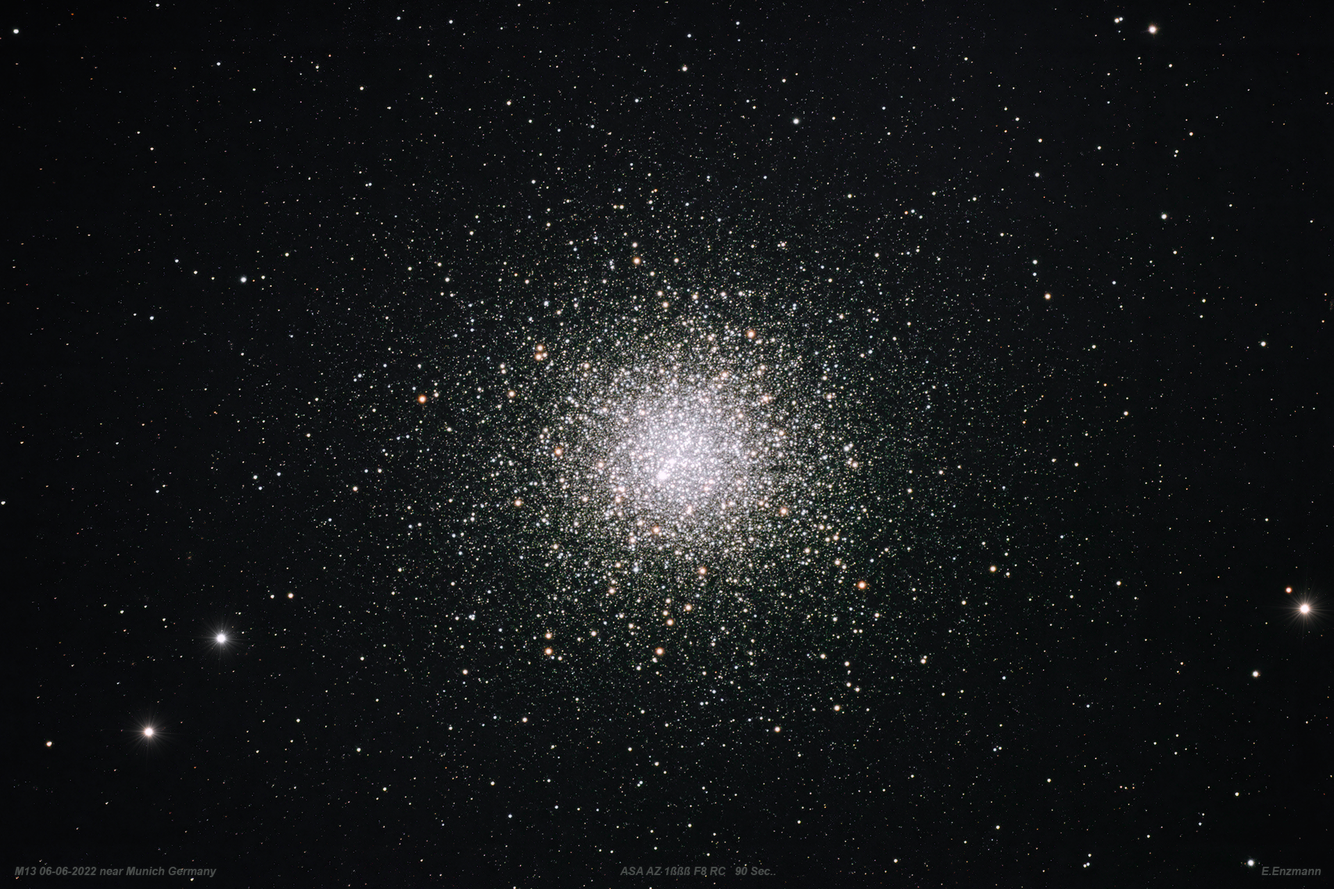Dies ist eine der bis jetzt wenigen Deep-Sky-Aufnahmen, die mit meinem ASA AZ1000 F8 RC gemacht worden sind. Es war noch ein alter Korrektor zu dem Zeitpunkt der Aufnahme eingebaut, der mittlerweile durch einen Höherwertigen ersetzt wurde. M13 ist aufgrund seiner enormen Helligkeit eines der meist fotografierten Deep Sky Objekte bei uns in Deutschland und auch für kleinere Teleskope bestens geeignet. Außergewöhnlich ist der Umstand das dieses Bild mit einer handelsüblichen Canon EOS 5R Full Spektrum Version gemacht worden ist. Diese kann über einige Canon Händler direkt bezogen werden. Es entfällt somit das Entfernen vom IR Sperrfilter durch externe Firmen, die solche Umbauten anbieten was in aller Regel einen Garantie Verlust mit sich bringt. Es ist erstaunlich was diese Kamera leistet im Vergleich mit gekühlten Astrokameras. Das Bild ist aus nur 30 Einzelbildern mit jeweils 3 Sekunden Belichtungszeit gemacht. Das heißt die gesamte Belichtungszeit sind nur 90 Sekunden! Da die Zeit, Jupiter und Saturn gut aufzunehmen, ihrem Ende entgegen geht, werde ich sicherlich nun auch verstärkt Deep-Sky-Objekte mit dieser Canon R5 Full Spektrum in Angriff nehmen.