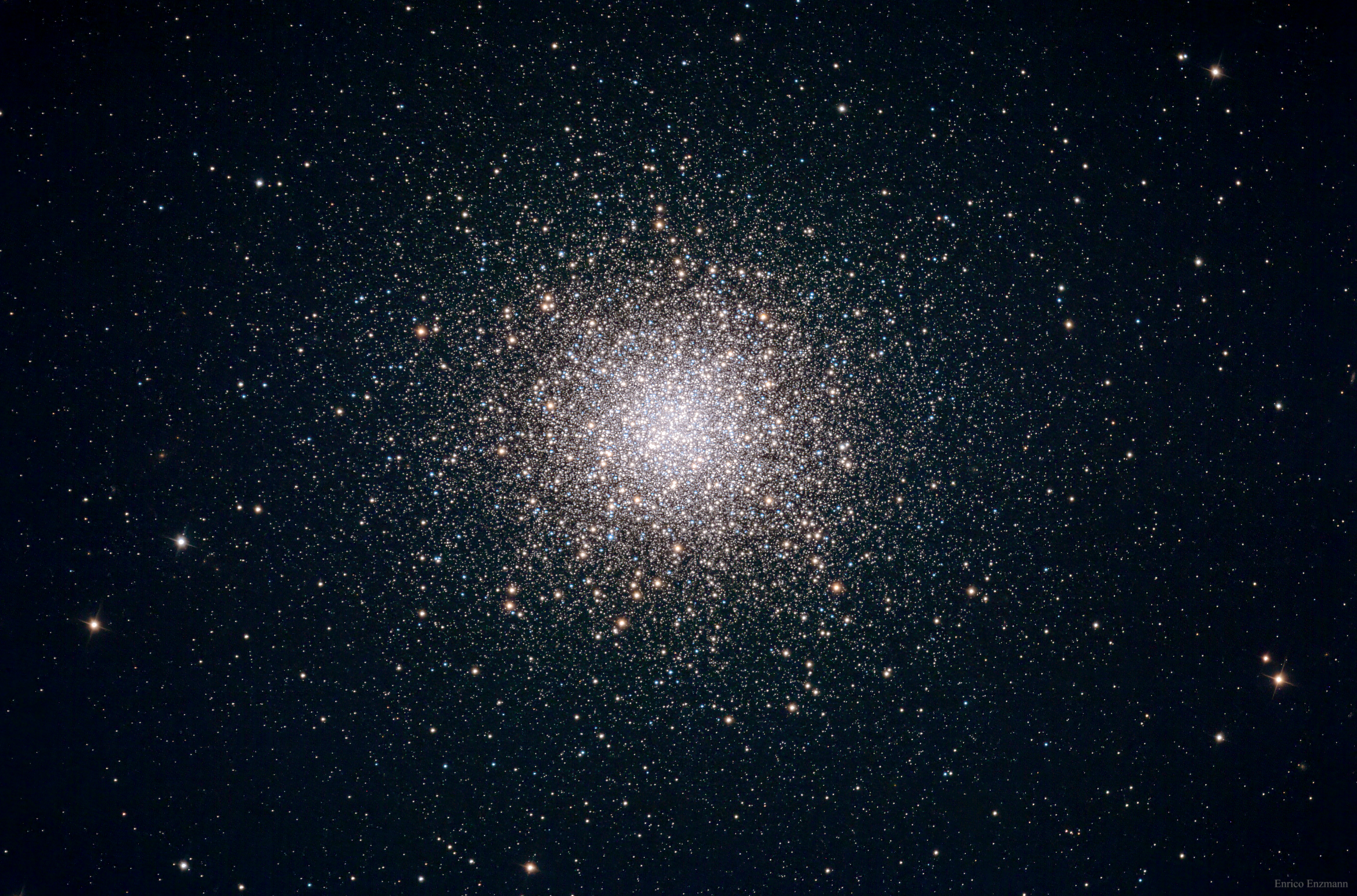 Ein weiteres Deep-Sky-Bild vom 5. Juni 2024, wo das Seeing recht gut war. Es zeigt den Kugelsternhaufen M13, der ungefähr 25000 Lichtjahre von uns entfernt ist. Es wurden 150 Bilder mit einer Canon R5 mit entfernten IR Filter mit je 6 Sekunden Belichtungszeit gemacht. Die besten 60 Bilder wurden gestäckt und mit den angegebenen Bildbearbeitungsprogrammen final gerechnet. Es wurden keine Darks oder Flats verwendet.