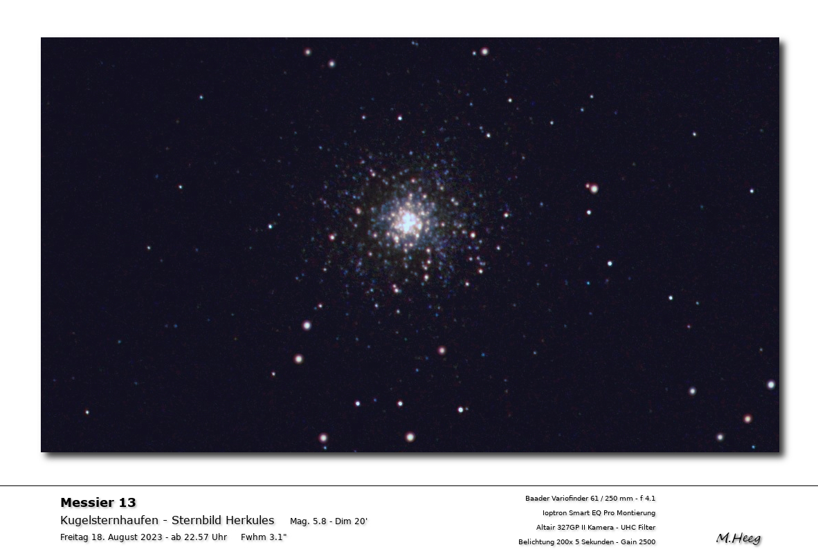 »Stadtlichtastronomie« ... Auch mit kleiner Ausrüstung sind helle, astronomische Objekte in der Stadt beobachtbar und abzulichten. Im gezeigten Fall ist es der sehr bekannte Kugelsternhaufen Messier 13 im Sternbild Herkules. Entsprechende Infos hierzu sind in der Bildunterschrift zu finden. Für mich ... insgesamt eine tolle astronomische Hobbytätigkeit. Viele Grüße sendet Marco Heeg.