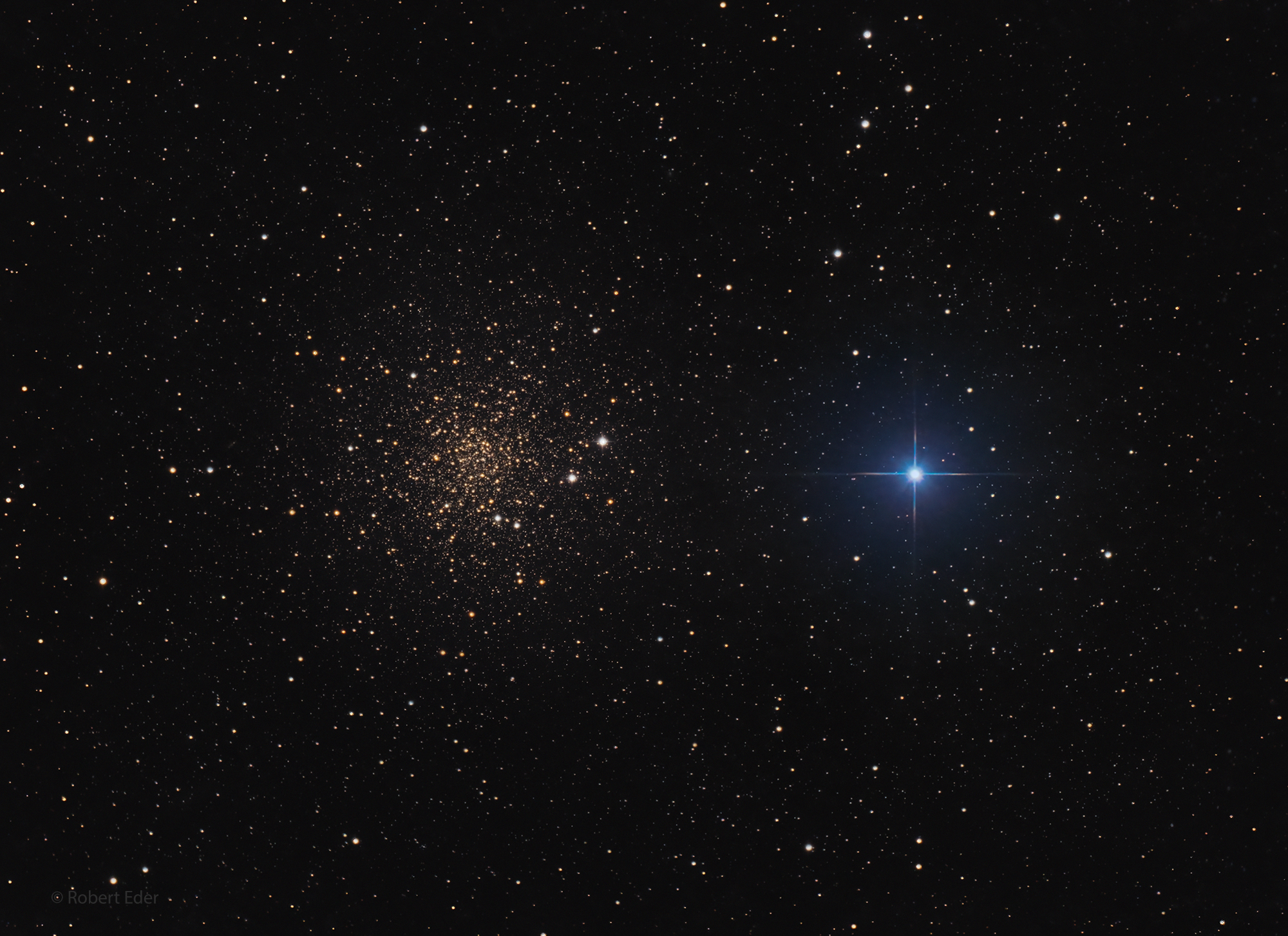 NGC 6366 ist ein Kugelsternhaufen im Sternbild Schlangenträger in einer Entfernung von rund 11700 Lichtjahren. Sein lichtschwaches und rötliches Erscheinungsbild entsteht durch die geringe Dichte und interstellaren Staub, der den Haufen abdunkelt. Mir gefällt besonders der farbliche Kontrast zwischen dem roten Sternhaufen und dem hellen Blauen Stern HD 157950.