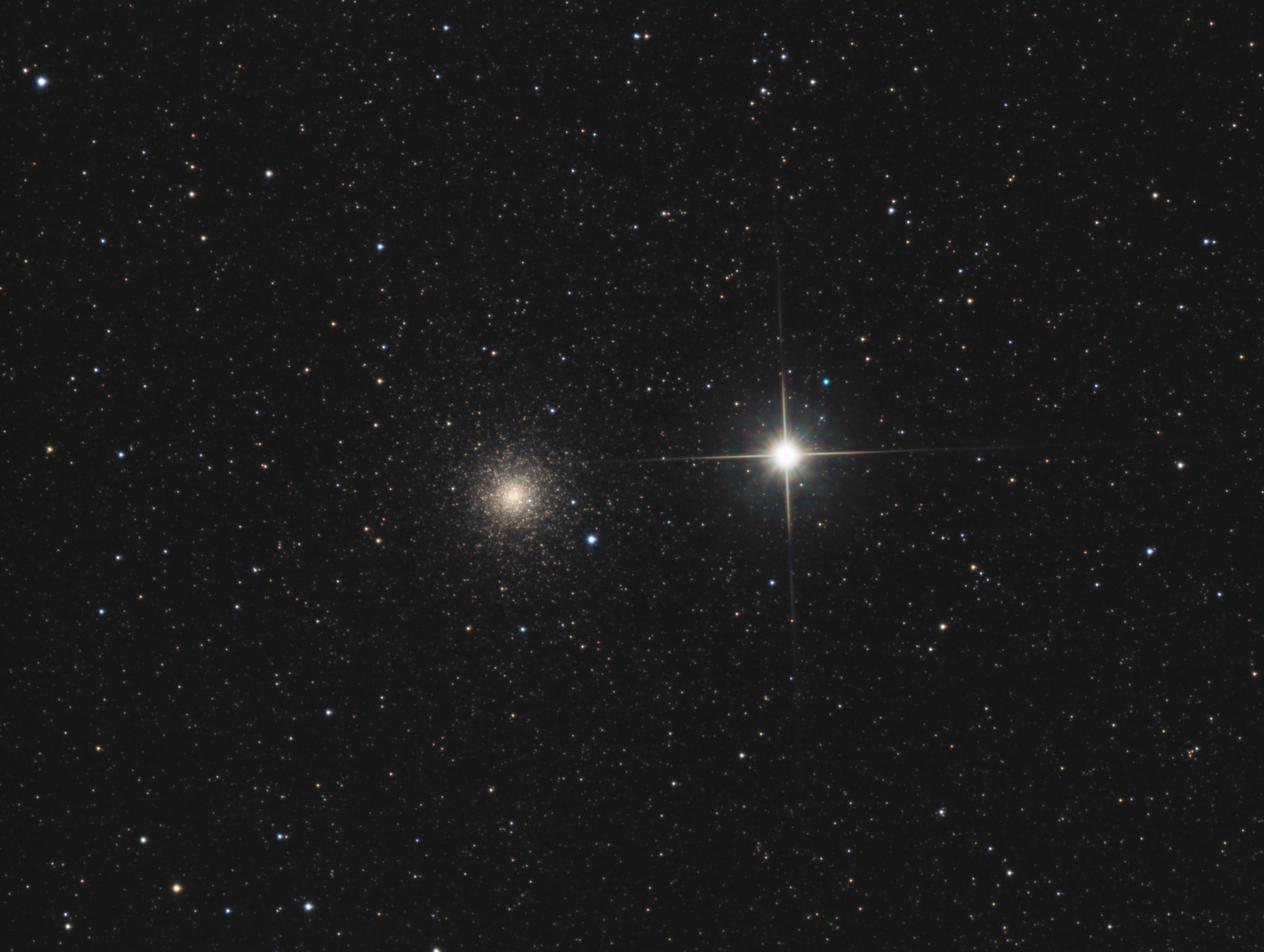 Eine neue Aufnahme von dem sehr fotogenen Pärchen, dem Kugelsternhaufen NGC 6441 neben dem hellen Stern G Scorpii im Sternbild Skorpion. Mit Hilfe von Einzelbelichtungen mit jeweils einer Sekunde Dauer konnten wir die Auflösung im Vergleich zur letztjährigen Aufnahme deutlich steigern. Mehr Infos unter: http://www.chamaeleon-observatory-onjala.de/