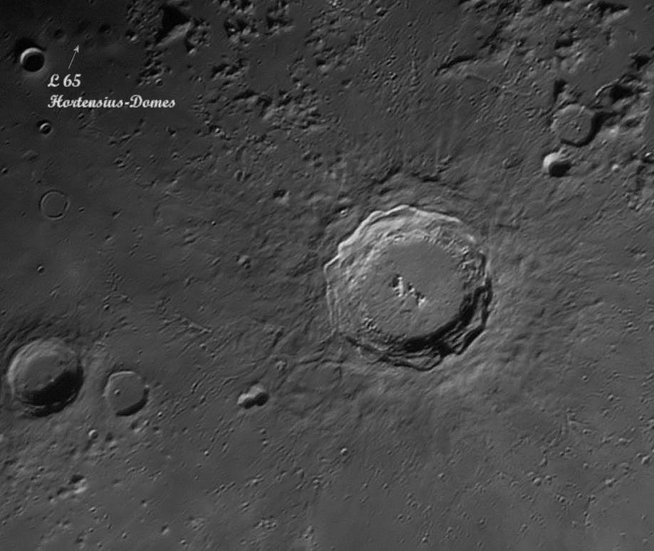 Neben dem Kopernikuskrater mit mehreren Zentralbergen sind in der Umgebung des kleinen Kraters Hortensius die Domeobjekte zu sehen, die den Eindruck erwecken, systematisch angeordnet zu sein.