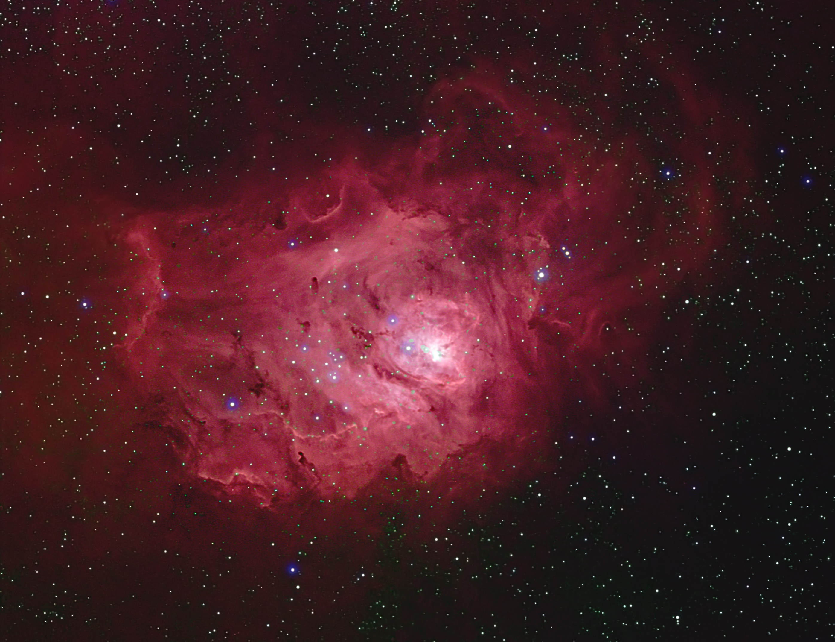 Der Lagunen-Nebel erreicht bei uns in Peine maximal eine Höhe von 13 Grad über dem Horizont und ist nur im Sommer in verhältnismäßig kurzen Zeitabschnitten beobachtbar. Eine klare Nacht mit guten Bedingungen ermöglichte trotzdem diese Aufnahme, wobei außer den üblichen Farbfiltern auch ein H-Alpha-Filter eingesetzt wurde.