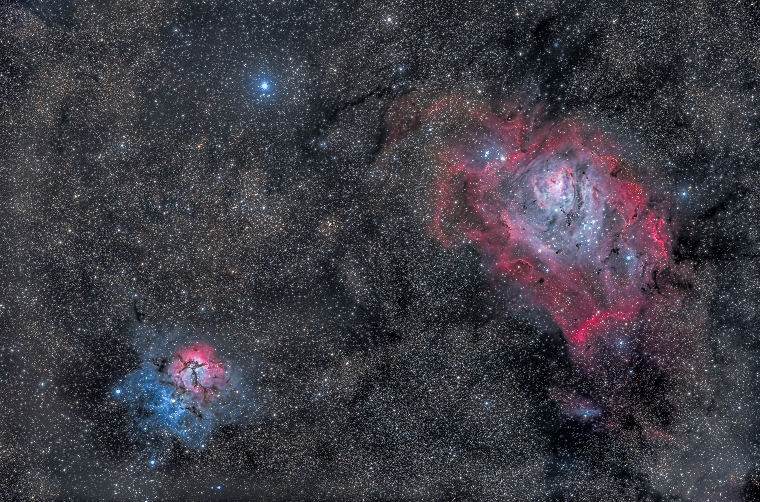 Messier 20 und Messier 8 sind die Katalognamen des Trifid- und Lagunennebels. Beide Objekte liegen im Sternbild Schütze, das in unseren Breitengraden nicht besonders hoch über den Horizont kommt. Für dieses Bild war daher ein Kurztrip nach La Palma notwendig, dort stand der Schütze morgens Anfang April schon stattliche 30 Grad hoch.