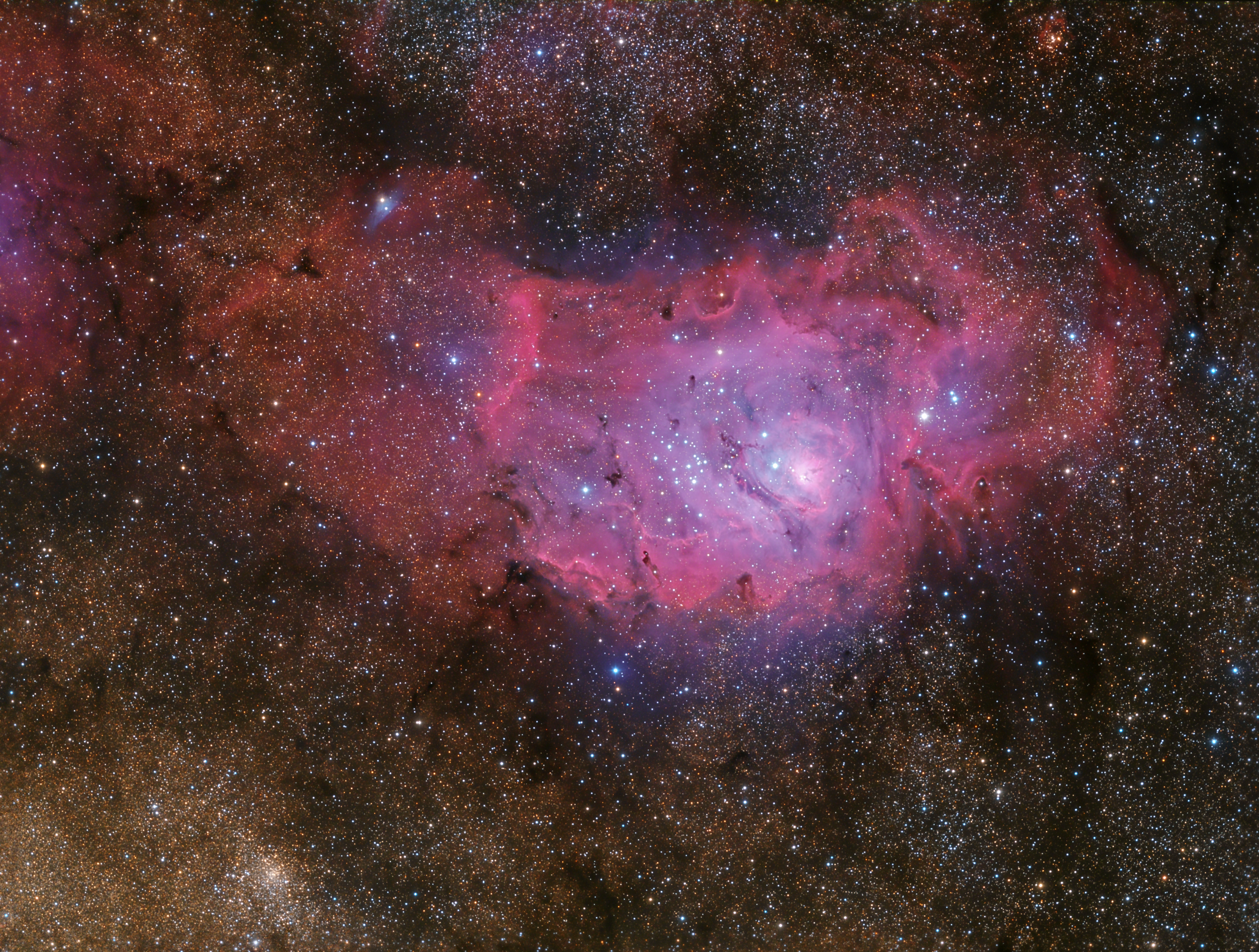 Die Aufnahme entstand bei meinem ersten Aufenthalt in Namibia (Kiripotib Guest Farm). M 8 steht dort im Zenit. Eigentlich ein Schnappschuss, doch die exzellenten Bedingungen in der namibischen Wüste haben sehr gute Rohdaten geliefert. Diese Aufnahme wäre mir mit der kurzen Belichtungszeit in Deutschland sicher nicht gelungen.