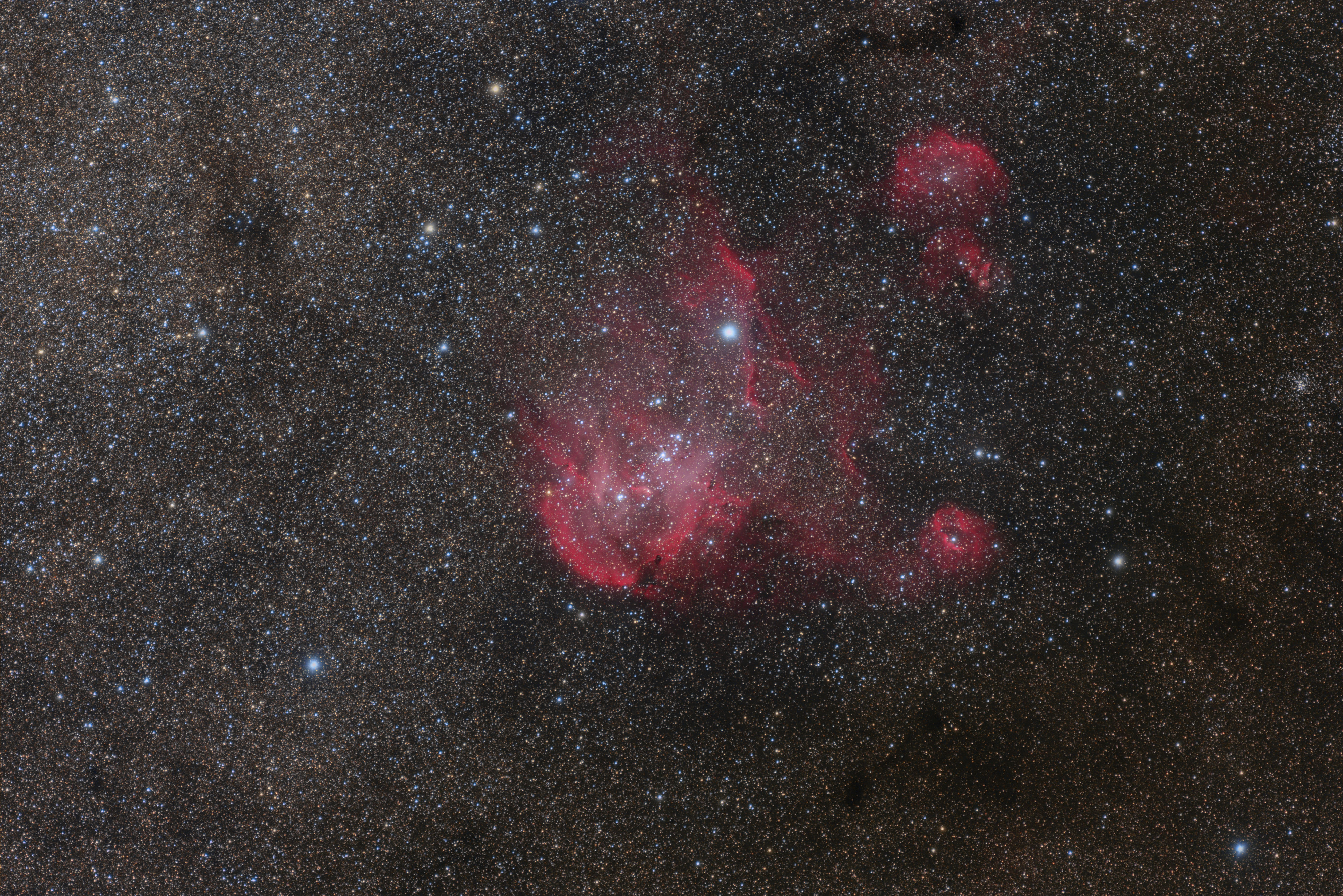 Der Lambda Centauri Nebel ist ein komplexes Sternentstehungsgebiet mit mehreren Kernen, neben den starken Emissionsanteilen gibt es auch Reflexionsnebel in der Nähe der eingebetteten helleren Sterne. In der Mitte sind kleine schwarze Flecke zu sehen, die Thackeray Globulen - kondensierte Materie silhouettiert gegen den leuchtenden Nebel.