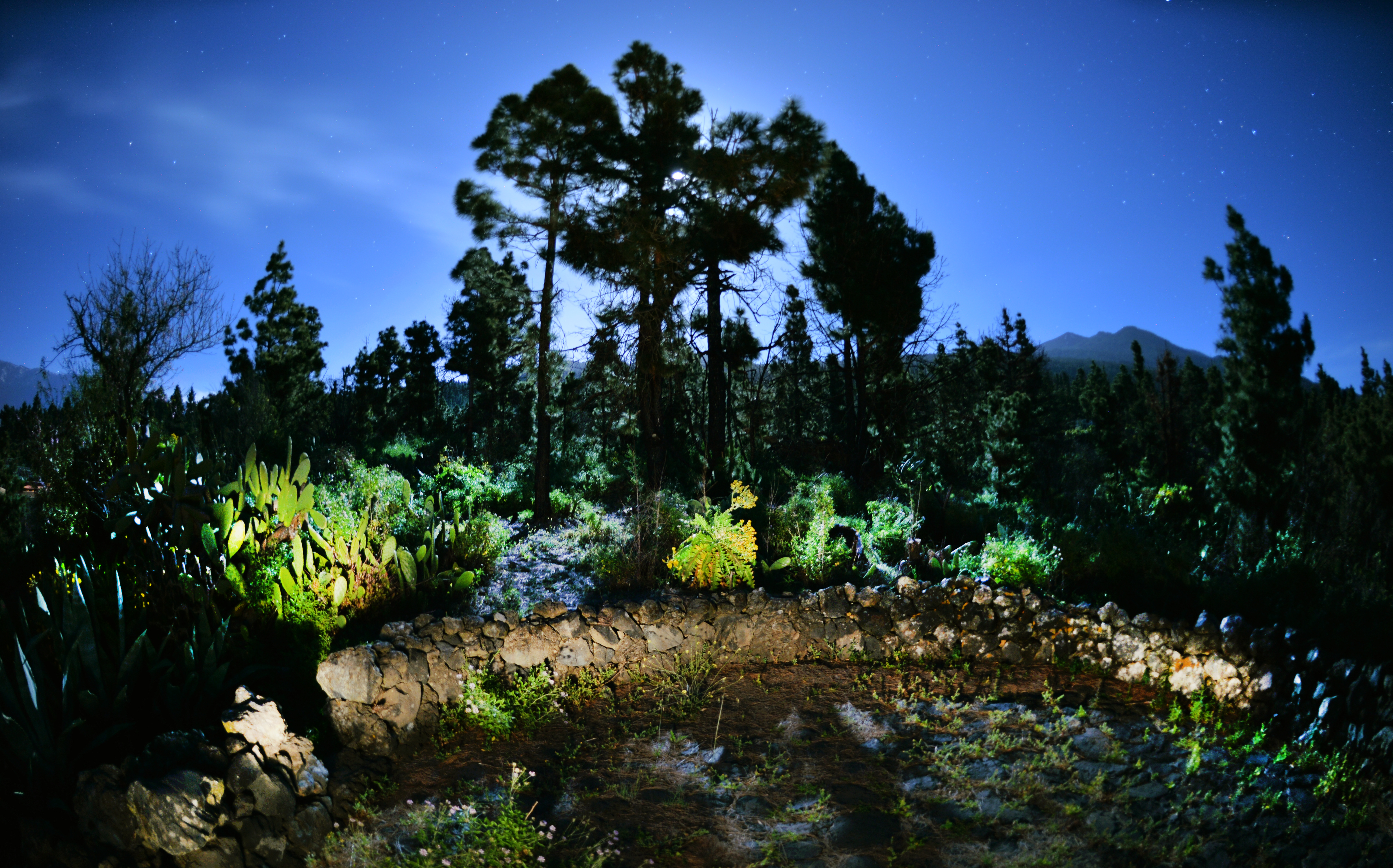 Nachtaufnahme mit Landschaft und Sternenhimmel über La Palma. Vordergrund mit einer Taschenlampe beleuchtet bei Mondlicht hinter den Bäumen.