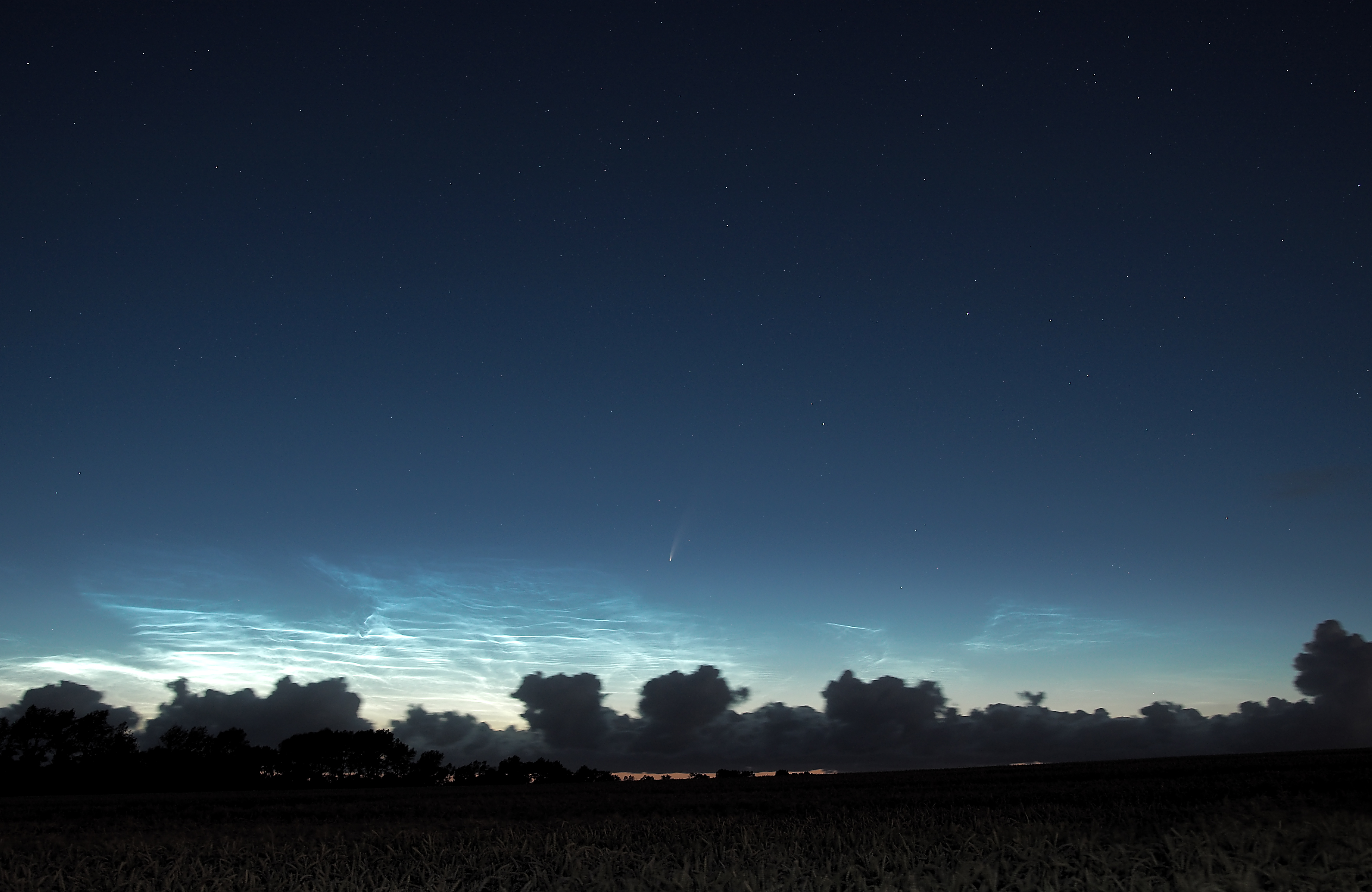 Eine Weitwinkelaufnahme der Ostseelandschaft mit normalen Wolken. Darüber kommen die hellen nachleuchtenden Wolken und darüber dann der Sternenhimmel mit dem aktuellen Kometen Neowise.