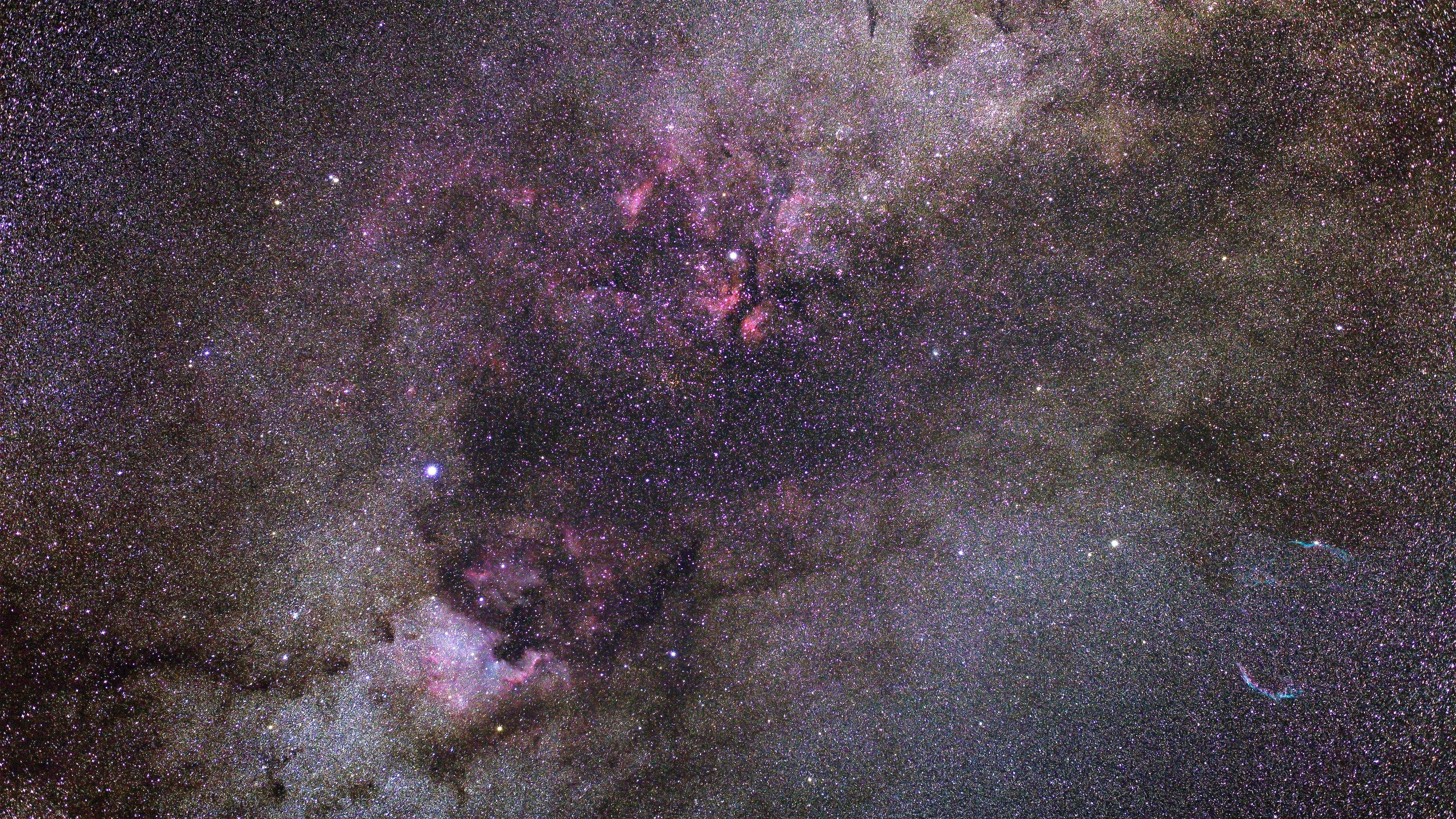 Im hier gezeigten Bereich des Sternbilds Schwan ist die Milchstraße sehr dicht "besternt". Es sollten Nordamerikanebel (siehe die entsprechende Form unten links im Bild), daneben der Pelikannebel, aber auch der Supernova-Überrest Zirrusnebel (die farbigen Bögen rechts unten) mit aufs Bild. Ich war von dem Ergebnis sehr überrascht - so plastisch mit den vielen Dunkelwolken hatte ich diesen Bereich noch nicht gesehen. Das Bild stammt aus einer einzigen Aufnahme.