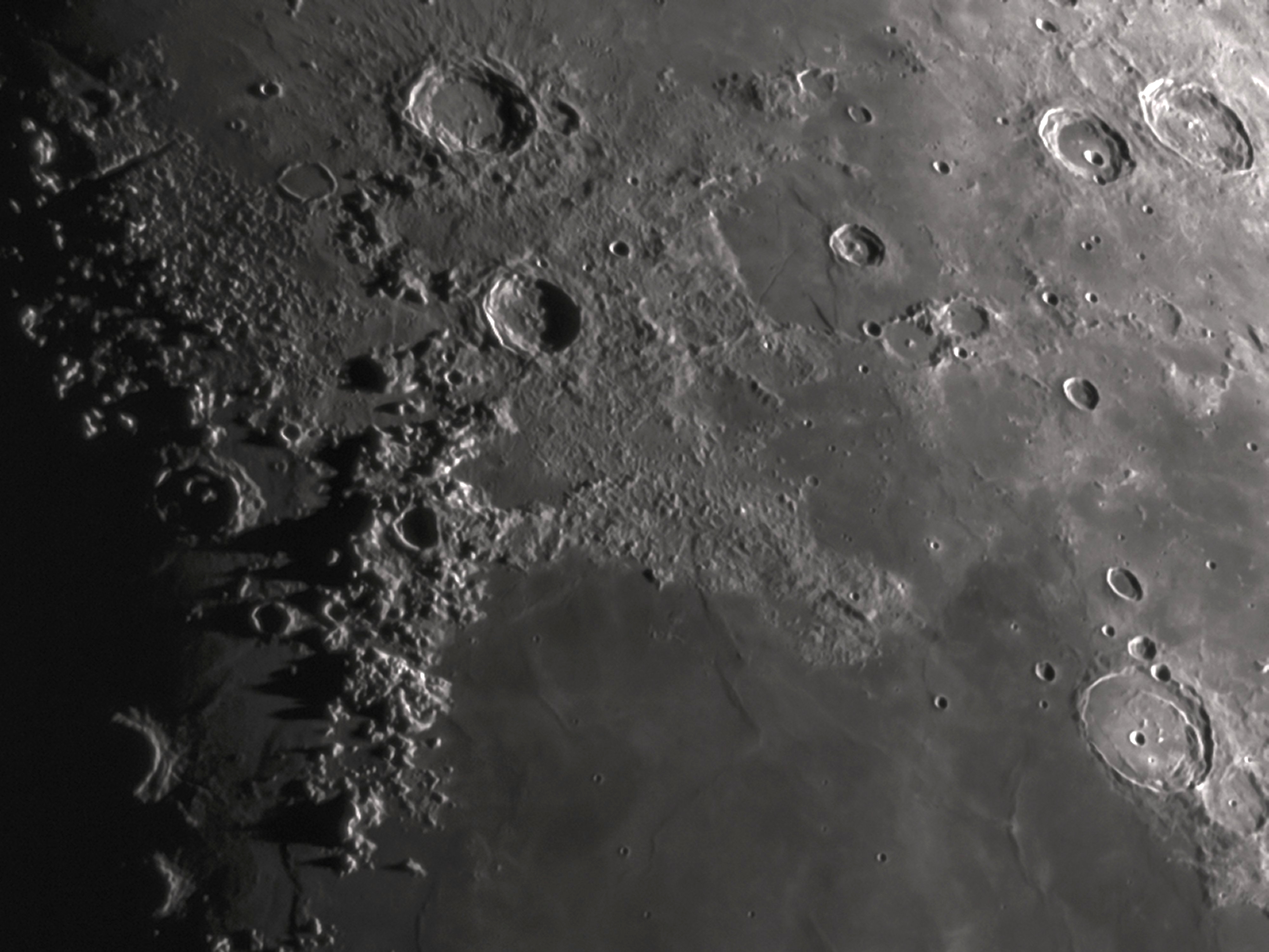 Am 22. Februar 2018 um 18:15 Uhr warf der Gipfel des Kaukasusgebirges, unmittelbar westlich des Kraters Calippus einen mächtigen Schatten in das Meer des Regens, der bis zum Krater Cassini reichte. An dieser Stelle ragt der Kaukasusgipfel bis zu 6000 Meter über das Niveau der umliegenden Meere. Rechts im Bild die Rimae Bürg und Krater Bürg, beide im See des Todes liegend, sowie der Krater Hercules. Es handelt sich hier um einen ersten Versuch mit dem langen und schweren Newton 300/1500 dem die CGEM DX eigentlich nicht gewachsen ist... Nur zwei avi's von 10 verwendbar...Schade!