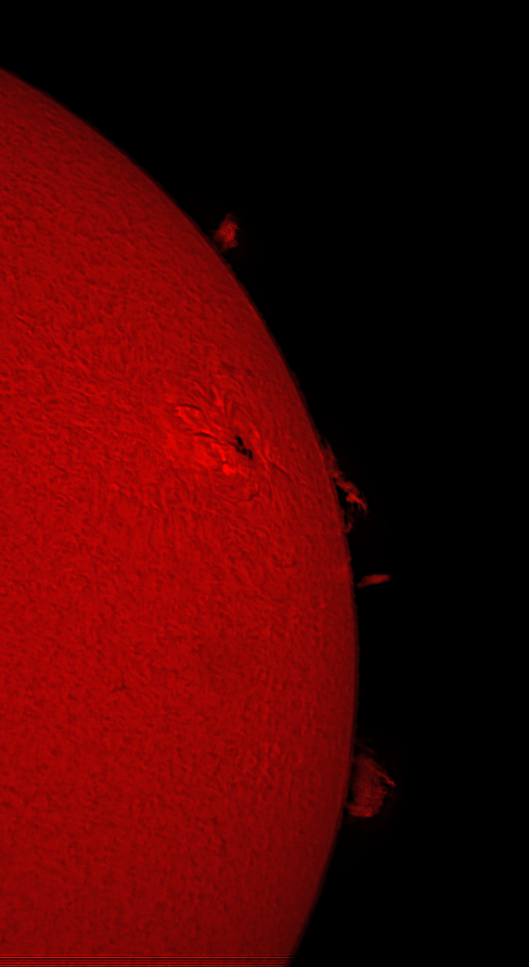 "Gebrochenen Herzens" (offensichtlich ist er auseinander gedriftet) verabschiedet sich der große Sonnenfleck. Allerdings mit einem Feuerwerk am Sonnenrand! Die Wolkenlücke gab Platz für diese Aufnahmen mit dem kleinen, aber bewährten PST.