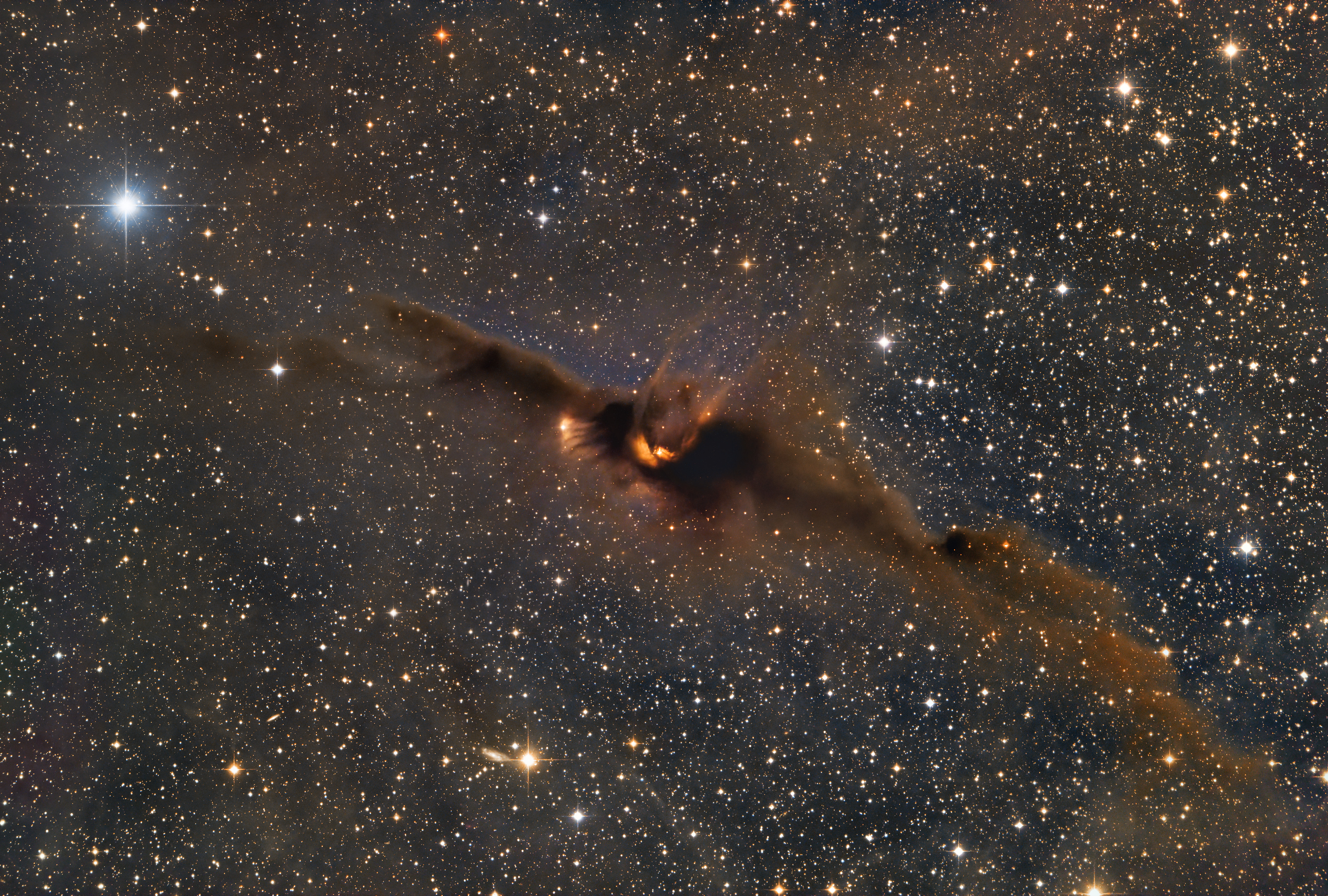 LDN 43 befindet sich im Sternbild Schlangenträger (Ophiuchus). Der Dunkelnebel wird auch als kosmische Fledermaus bezeichnet, man könnte darin aber auch einen kosmischen Batman sehen. Damit dieser schön durchs All segelt, ist das Bild so gedreht, dass sich Norden unten befindet. Die übliche Orientierung bei Astrofotos ist Norden oben.