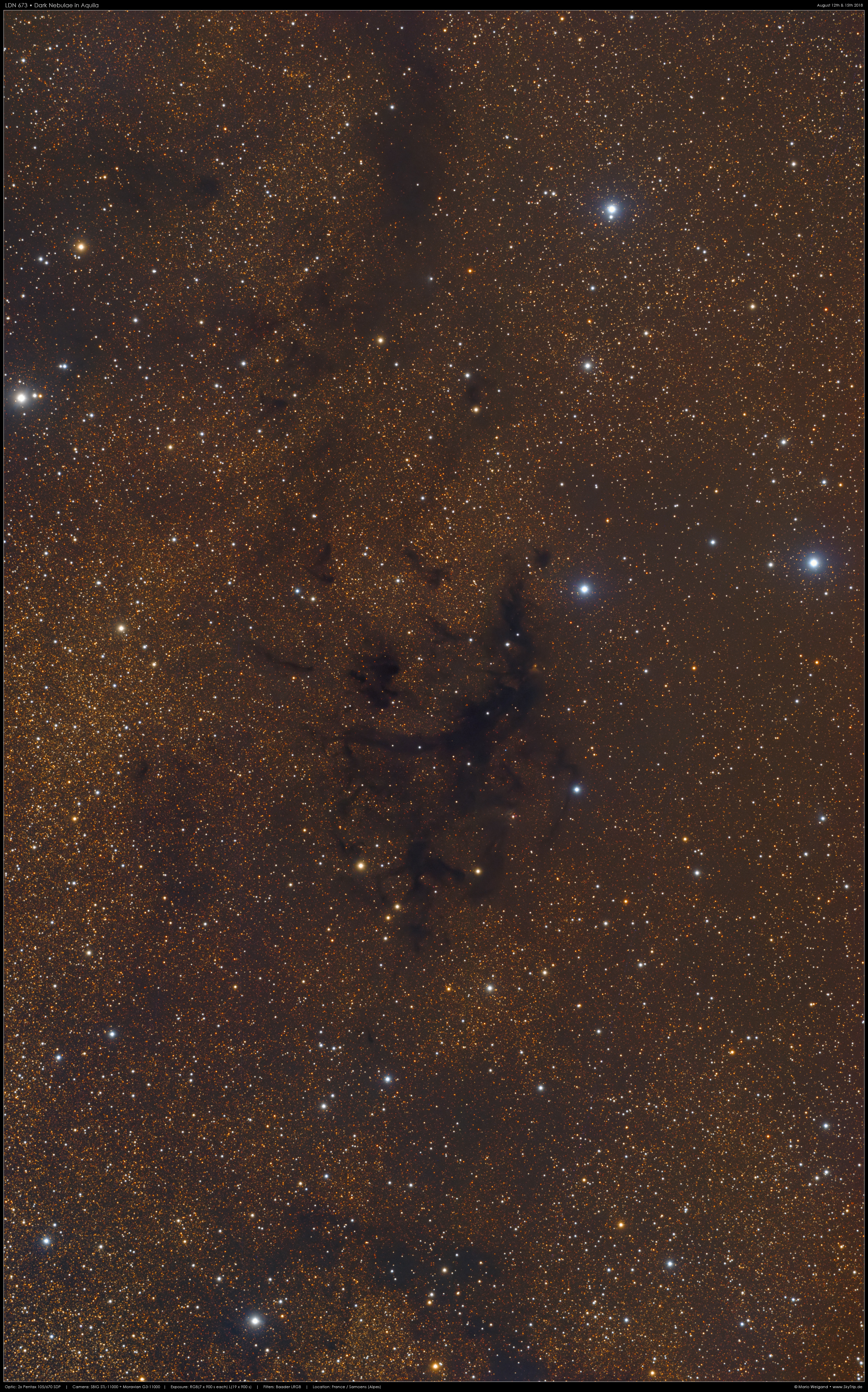 DN 637 ist ein stark segmentierter Molekülwolkenkomplex im Sternbild Aquila, mitten im sogenannten »Aquila Rift«, einem dunklen Bereich der Sommermilchstraße, der voller Dunkelwolken ist. Die dichten Wolken sind rund 300 bis 600 Lichtjahre von uns entfernt und über 7 Lichtjahre verteilt. An zwei Stellen reflektieren die Staubwolken das Licht naher Sterne. Dies ist zum einen GN 19.18.0 und zum anderen V1352, ein variabler T-Tauri-Stern. Diese Objekte sind Anzeichen für gerade aktive Sternentstehung. Sie sind mit kompakten Emissionsnebeln (Herbig-Haro-Objekte) assoziiert. Zumindest HH32 bei V1352 könnte auf meinem Bild zu erkennen sein - mehr dazu: