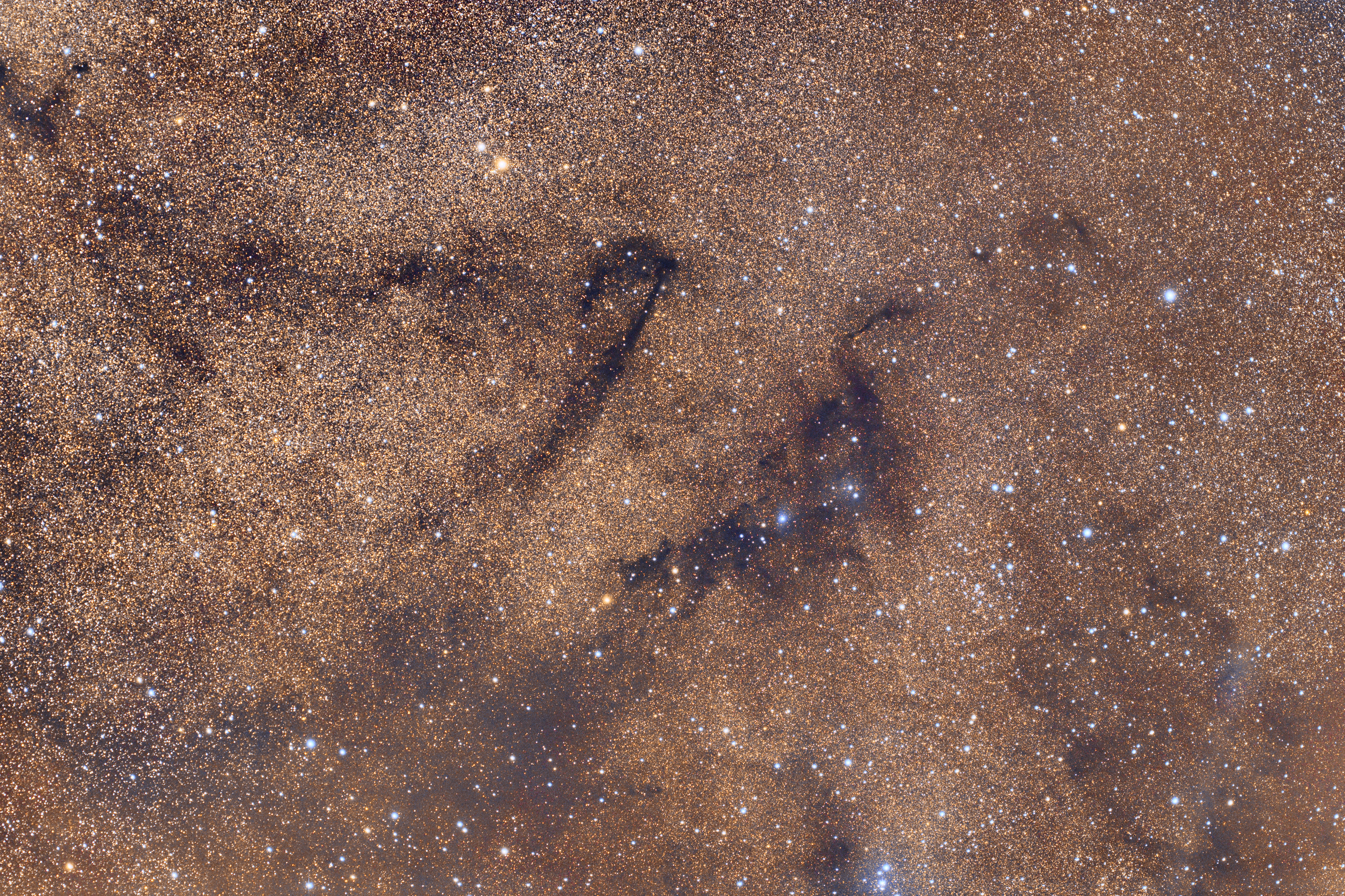 Der Wunsch zu dieser Aufnahme ist entstanden, als ich eine Weitwinkelaufnahme des Bereichs des prominenten Coathanger-Sternhaufens angefertigt habe. Somit stand der Entschluss fest mit meinem kleinen Apo eine Aufnahme dieser beiden Dunkelnebel zu erstellen. Auch die Brennweite von 350 mm passte perfekt, um eine schöne Bildkomposition zu erreichen. Trotz des etwas störenden Monds ist ein ansehnliches Bildergebnis dieser eher seltener gezeigten Region entstanden.