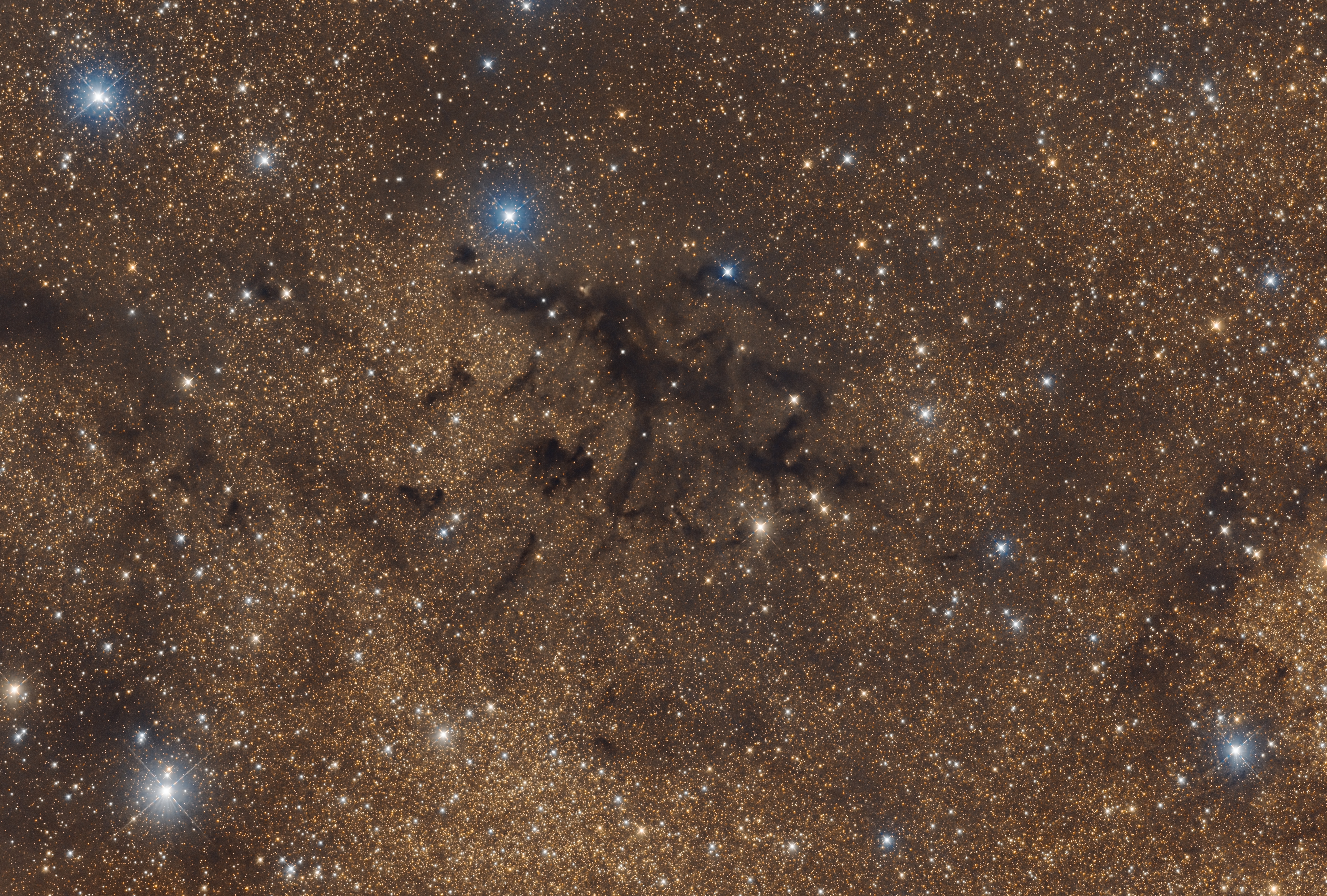 LDN673 ist ein Molekülwolkenkomplex im Aquila Rift, einem dunklen Teil der Sommermilchstraße. Die Extinktion durch Molekülwolken lässt viele der Sterne rötlich erscheinen. Um das Objekt in einer Zone mit erheblicher Lichtverschmutzung aufnehmen zu können, waren mehrere hundert Einzelaufnahmen, verteilt über drei Nächte, nötig.