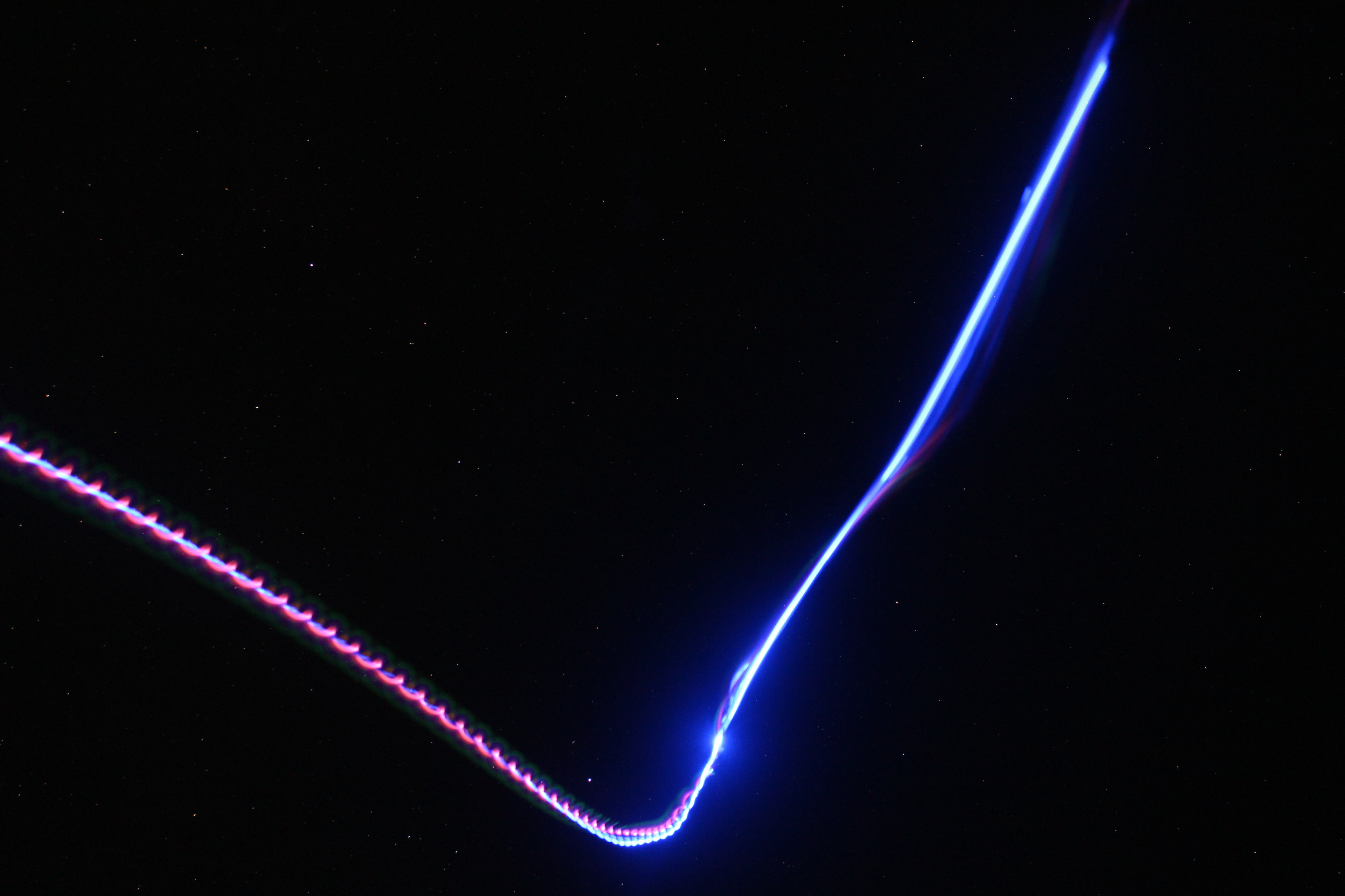 Ein LED-Pfeil ist ein interessanter Partyartikel. Er besteht aus einem Pfeil aus Kunststoff mit einer LED, einer Batterie und einem Schalter, mit dem bei Nichtgebrauch die LED abgeschaltet werden kann. Ein LED-Pfeil wird mit einer Steinschleuder in die Luft geschossen, was einige Übung bedarf. Für eine weiche Landung sorgen zwei floureszierende Kunststoffflügel, welche während des Sinkfluges eine bremsende Autorotation machen und durch ihre Floureszenz die Erscheinung eindruckvoller machen. Auf diesem Bild durchfliegt ein solcher Pfeil die Sternbilder Leier und Schwan.