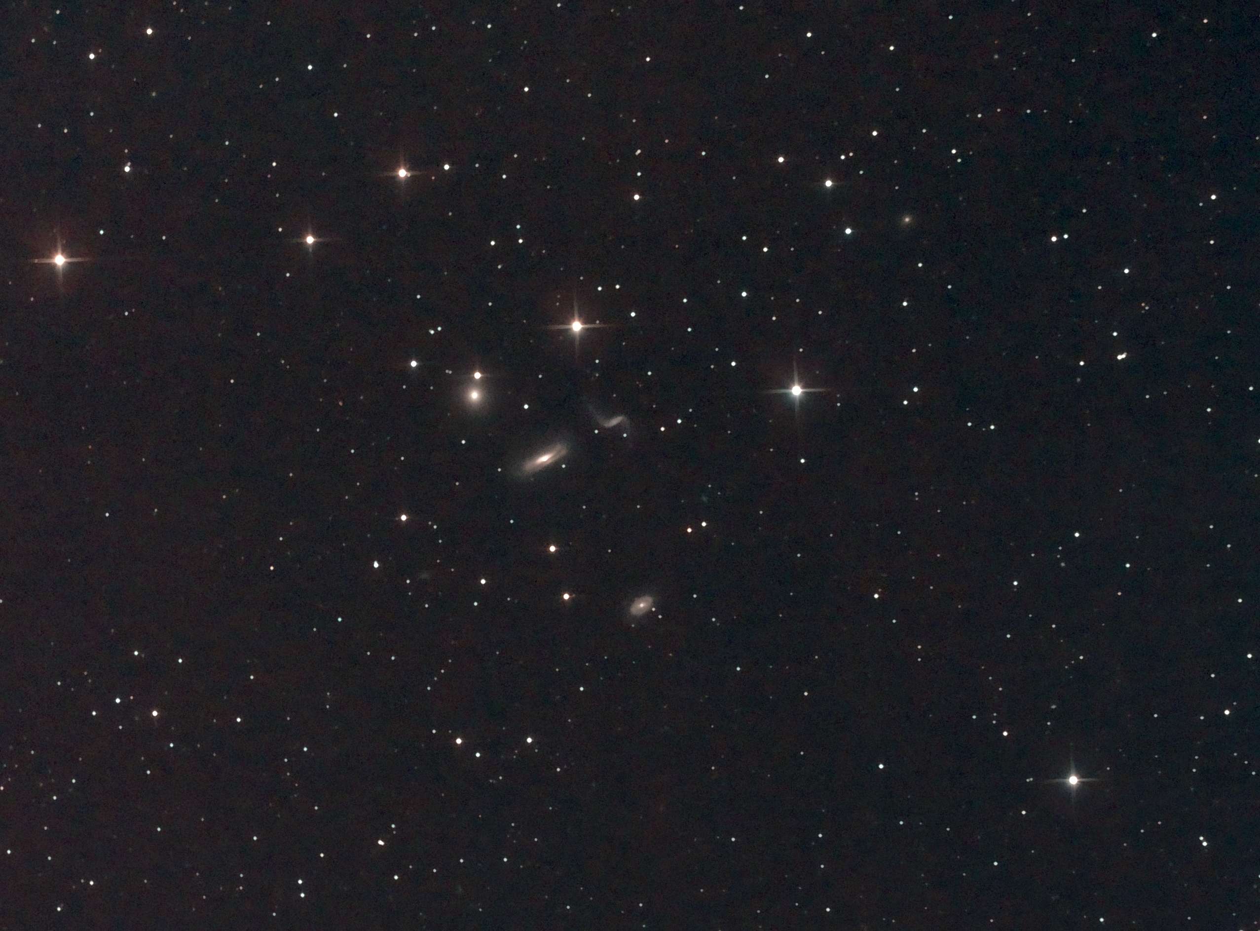 Nach einem anstrengenden Arbeitstag hatte ich keine Lust mehr, meinen Kleingarten, in dem der 8-Zöller des Aufbaus harrte, aufzusuchen. Also machte ich wieder einmal meine Balkonsternwarte betriebsklar, richtete meinen "Kleinen" (130/650 mm-Newton) auf das Leo-Qartett im Kopfbereich des Sternbildes Löwe und startete eine Belichtungsreihe. Die Mitglieder dieser interessanten kleinen Galaxiengruppe, auch Hickson 44 oder Arp 316 genannt, zeigen teilweise deutliche Verformungen infolge der zwischen ihnen bestehenden gravitativen Wechselwirkungen. Für detaillierte Aufnahmen benötigt man wesentlich längere Brennweiten, als die von mir eingesetzte. Das hielt mich aber nicht davon ab, es auch mal zu versuchen. Wie ich meine, war das keine gravierende Fehlentscheidung.