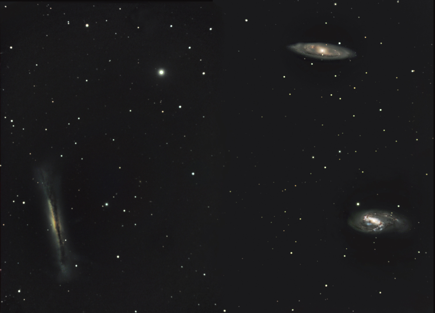 Das Bild ist aus zwei LRGB-Aufnahmen zusammengesetzt. Es zeigt NGC 3628, M 65 und M 66.